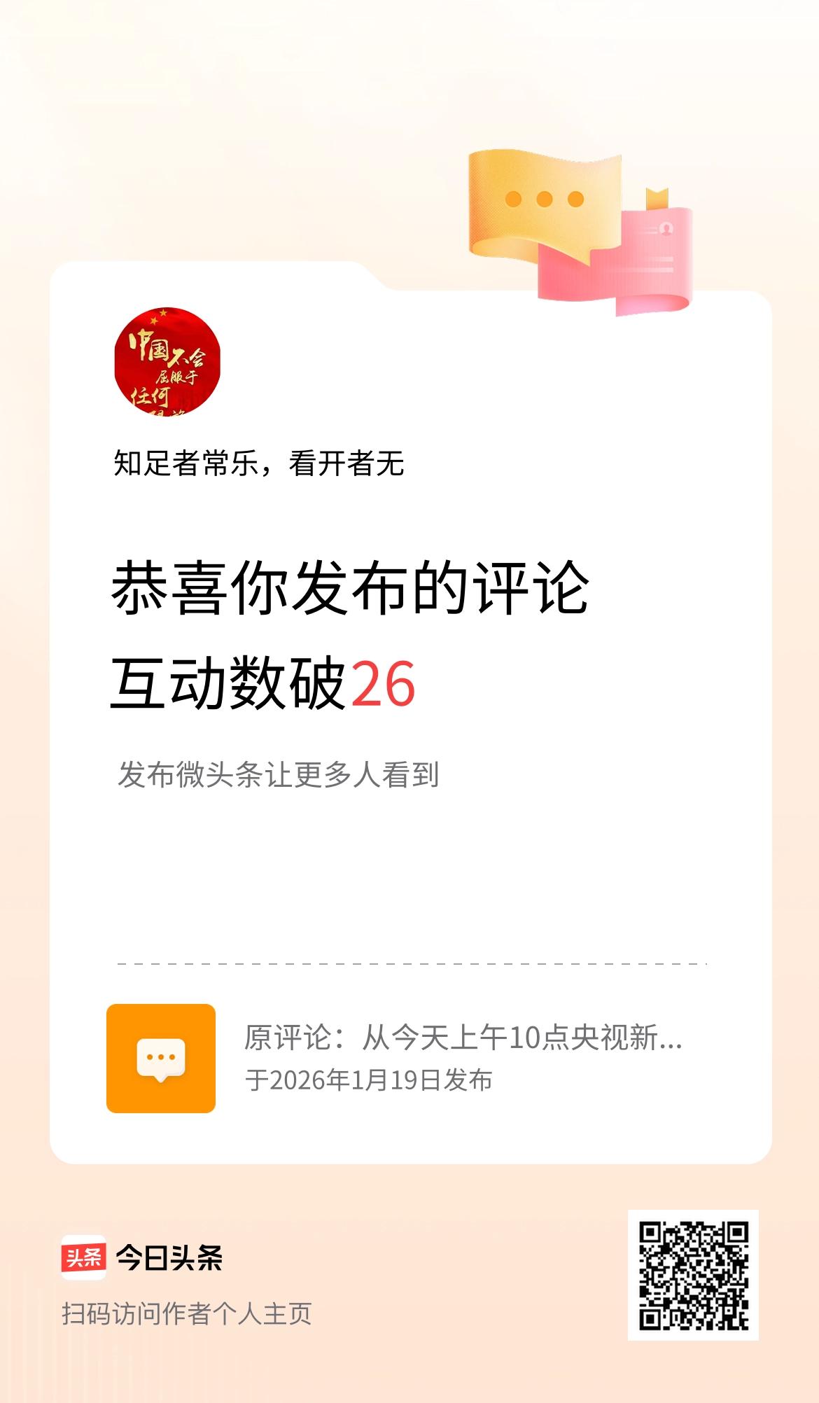 我发布的评论:从今天上午10点央视新闻中,神舟20号返回舱带回来的退役航天服不但有出舱航天员签字,而且凝聚着20位航天员心血。 由于舱外航天服体积大,神舟21号航天员用大号黑布袋将舱外航天服装进去。 一旦进行展出时,肯定是吸引亿万民众参观。[赞][赞][赞][赞][赞][赞][赞][赞] 互动数破26了!