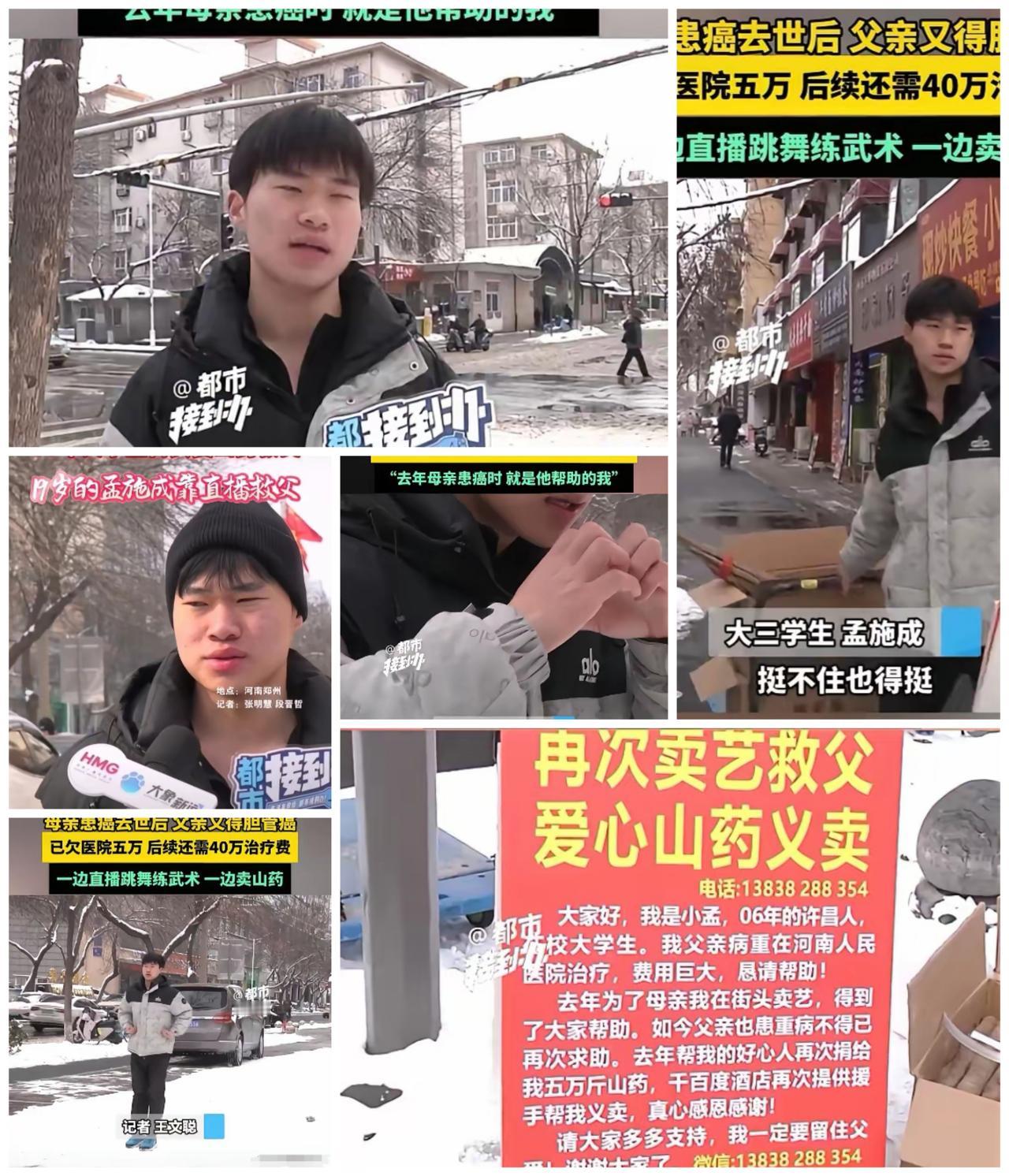 母亲患癌去世,父亲患癌还在ICU抢救,19岁的孟施成还在上大学的年纪,零下十度左右天气靠直播卖山药赚钱,独自挑起了家里的负担。 零下十度的山药直播里,藏着19岁少年的背水一战雪刚停的夜晚,你在温暖的室内滑动屏幕,屏幕那头的孟施成在零下十度的街头直播卖山药。 他说话时呼出的白雾,和手机屏幕上不断跳出的“加油”字样,构成了这个冬天最真实的画面——一个少年正用冻僵的手指,为ICU里的父亲抢回每一分生存的可能。 去年七月母亲因癌离世,今年父亲又躺进重症监护室,命运对这个19岁的大学生展示了最残酷的一面。当同龄人讨论考试和梦想时,他面对的考题是几十万医疗费、数万债务和尚未支付的学费。然而你看他的直播,听不到抱怨,只有一句句认真的介绍:“这是我们家乡的山药……” 他跳的舞或许笨拙,他的直播或许生涩,但这份生涩里有着最坚韧的生命力。这不是卖惨,这是一个人在绝境中能拿出的全部武器——尊严、坚持和不灭的希望。他让我们看到:当生活剥夺你一切时,你还有自己可以依靠。 全网在帮他,因为我们在他身上看到了自己不愿面对的可能性,更看到了人性最亮的闪光:越是黑暗处,越要活成一道光。他的每一场直播,不仅是卖货,更是在证明——有些责任,一旦扛起就不会放下。 雪夜里,这个少年不是在卖山药,他是在用最原始的方式,向命运宣战。而我们每一次转发和购买,都是在为这份不屈投票。如果你也在关注他的故事,你觉得除了物质帮助,我们还能给他什么?