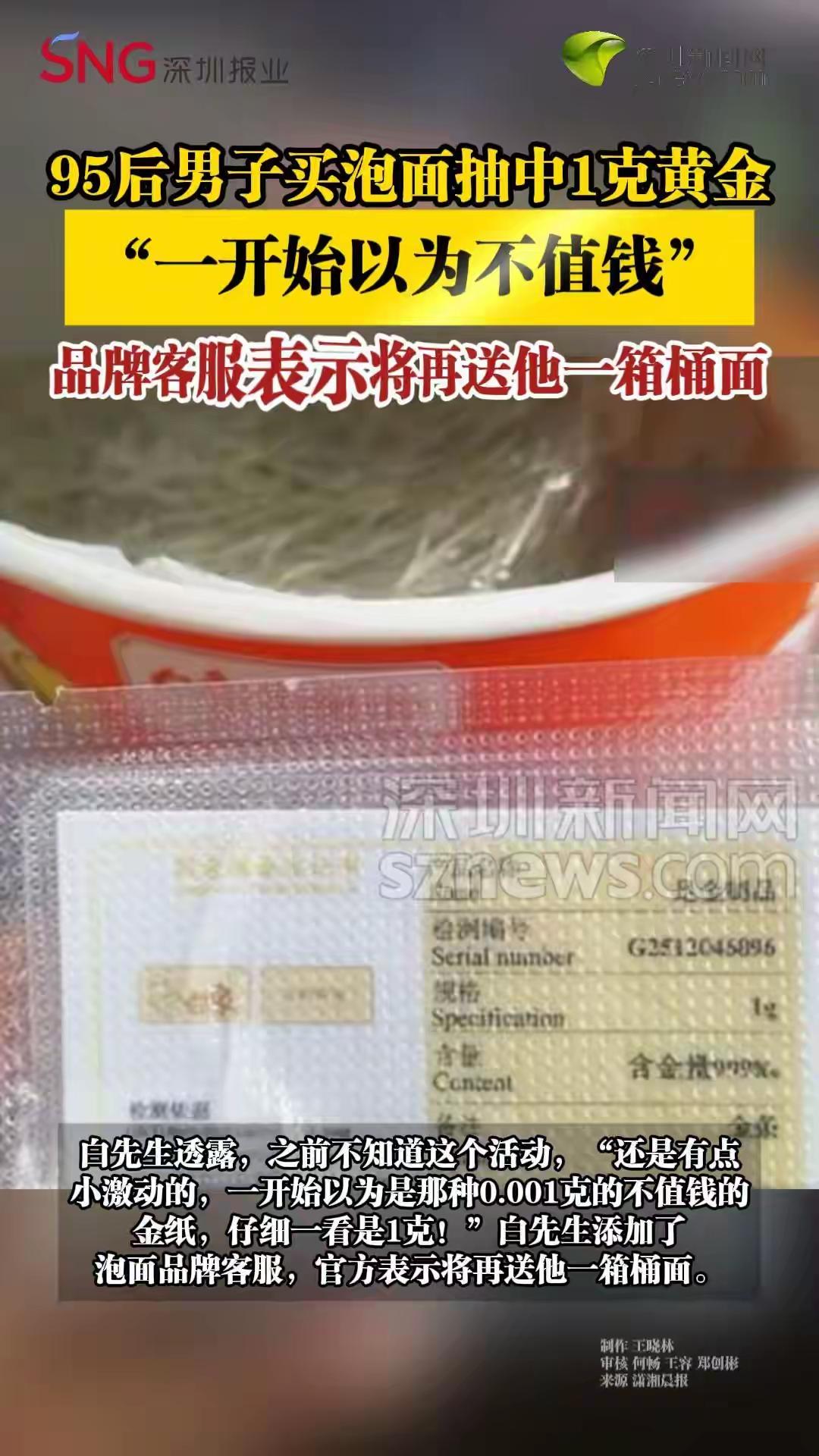 河南小伙雪夜随手买桶泡面竟抽中1克真黄金!便利店秒变“金矿”,网友直呼:这泼天的富贵终于轮到普通人了! 那个寒冷的雪夜,外卖迟到了。河南一位95后小伙子白先生,只是临时起意走进便利店,想用一桶热腾腾的泡面安抚咕咕叫的肚子。他随手拿起,付款,撕开包装——一个金色的小薄片掉了出来。他最初以为又是商家吸引眼球的“金箔纸”把戏,或许只值几分钱,便没太在意。 可当他捏在指尖,借着灯光仔细端详,心跳漏了一拍。那上面清晰的克重标记“1g”和成色标识,赫然告诉他:这是一克真黄金!不是噱头,不是玩笑。那一刻,小小的便利店仿佛被幸运的金光笼罩,一桶普通的泡面,变成了开启惊喜的钥匙。白先生坦言:“一开始以为是那种不值钱的金纸,仔细一看,很激动!” 这戏剧性的一幕迅速点燃了网络。人们惊叹于这份“雪中送炭”般的好运,更惊讶于这份大奖的实在。在当前金价一路高歌猛进,国内品牌金饰克价已普遍突破1500元大关的背景下,这一克黄金的价值远超泡面本身,更像是一个时代的小小注脚。它让普通人触摸到了“硬通货”的温度。 更深一层看,这份幸运背后,是品牌与消费者之间一次充满诚意的互动。不同于某些虚无缥缈的抽奖,实实在在的黄金奖励,传递出一种“不玩虚的”的厚道。这不禁让人联想到该品牌过往承担社会责任、雇佣残疾人员工等口碑。一次中奖,意外擦亮了品牌的信誉名片,这或许比广告更深入人心。 网友的评论区更是妙趣横生,成了快乐的源泉。有人调侃要拿着金属探测器去扫货便利店,有人急切追问到底是哪款泡面藏着“黄金屋”,还有人为品牌操心:“会不会是生产线金属超标?”幽默背后,是大众对这份“接地气”幸运的强烈共鸣和参与感。每个人都仿佛在问:这样的好事,什么时候能轮到我? 白先生的经历,像一颗投入平静湖面的石子,激起了层层涟漪。它让我们看到,在充满不确定性的生活中,那些微小而确切的惊喜何其珍贵。它不一定是巨额彩票,可能就藏在一顿匆忙的晚餐、一次随心的消费里。这份惊喜肯定了普通人的日常,也给疲惫的生活注入了一剂快乐的强心针。 当然,理性告诉我们,这样的幸运儿是凤毛麟角。但它真正的价值,在于提醒我们关注生活中的“小确幸”。在追逐宏大目标的路上,别忘了那些不期而遇的温暖和快乐。也许,好运就藏在下一个转角,下一份简单的选择里。 品牌方的后续处理也堪称典范:确认中奖属实后,不仅兑现黄金,还额外赠送一箱泡面。这份“买一送一”的诚意,将一次偶然的营销事件,升华成了一段佳话。它告诉我们,真诚永远是打动人心最强大的力量。 白先生的故事还在传扬,它已经超越了社会新闻本身,成了一个关于运气、诚意与平凡温暖的小小寓言。在这个冬天,它让我们相信,生活总会用意想不到的方式,奖励那些认真生活的人。你的下一次惊喜,或许就在下一桶泡面,下一杯咖啡,下一次不经意的转身之间。 (来源:综合自潇湘晨报、深圳新闻网及网络热议) 天降横财 泡面黄金