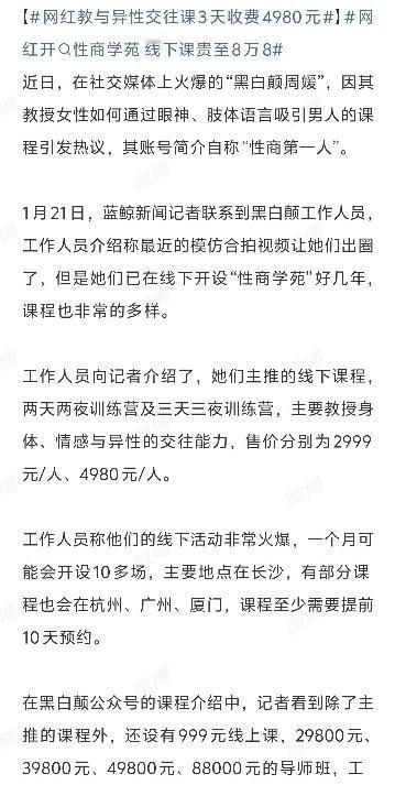 网红教与异性交往课3天收费4980元!!! 近日,社交媒体上超火的“黑白颠周媛”火出圈了,她教女性用眼神、肢体语言吸引男人的课程引发了不少讨论,她账号简介里还自称“性商第一人”。 她们主推的线下课程有两天两夜训练营和三天三夜训练营,主要教身体、情感方面跟异性交往的能力,收费分别是2999元/人和4980元/人。 这课程可不便宜,但还是有不少女性报名。为啥呢?因为现在好多女性都想提升自己在两性交往中的能力。不过呢,“黑白颠周媛”的教学方式遭到了很多质疑。 有人觉得,靠眼神和肢体语言吸引男人,就是一味迎合男性审美和需求,把女性摆在讨好的位置,不利于女性树立独立平等的价值观。而且课程说能提高“性商”,可这“性商”到底是啥也没说清楚,很容易误导女性,说不定还会传播些不当观念。 专家也说了,两性交往得建立在真诚和相互尊重的基础上,不能靠一些技巧去故意吸引。这种为了赚钱的课程,可能会让女性在追求“魅力”的时候迷失自己。 所以感情方面的事情,还是需要自己“努力” ,毕竟一个猴一个栓法,并不是所有的人都吃这一套啊!喜欢你的永远觉得你好,不喜欢的再怎么做都是闲的。所以姐妹们还是要擦亮眼睛,不要盲目消费!相亲 婚姻 恋爱 电影以年为单位的恋爱 销售 性商老师 男女私迷交学 婚恋培训老师 性商课程 两性课程 周老师婚姻咨询 戒色课 夜场情感课程 性人际关系 两性私密培训 两性培训 男性情感课 两性认知课 成人夜课 性教学 外魅课 男私研修班 性学讲师 情感边界课 来源:蓝鲸新闻