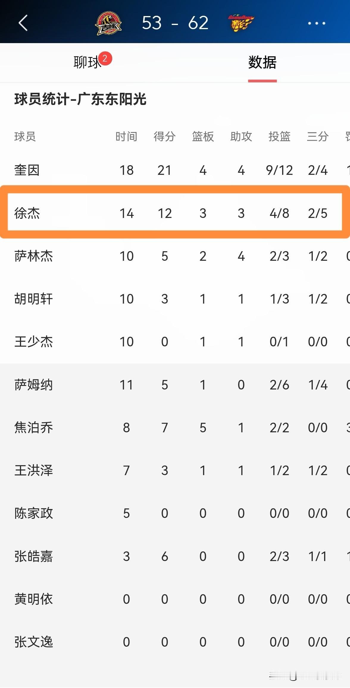 广东东阳光超级球星徐杰终于恢复正常了!在今天广东东阳光客场挑战长白山恩都里的比赛中,目前双方半场战罢,广东东阳光以62:53领先对手9分。在前两节比赛中,徐杰终于找回了久违的好状态,他在首发出战的14分钟里,投篮8中4,其中三分球5中2、罚球2中2非常高效的得到12分,还有3篮板3助攻1抢断,没有出现任何的失误和犯规,他的场上正负值为+10。 实事求是的说,只要徐杰能够在进攻端恢复到自己的正常水平,那么广东东阳光的进攻将会提升一个级别。