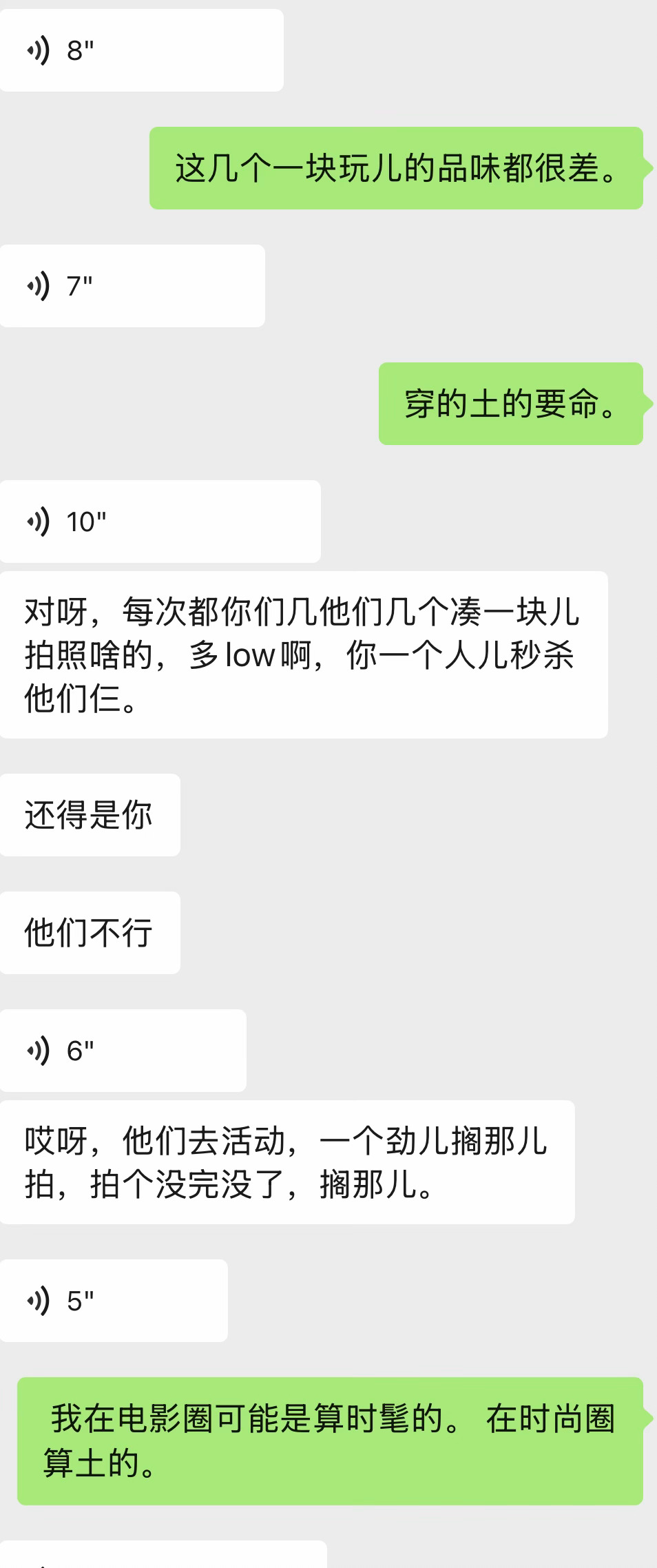 这几天我越来越觉得许多电影博主一个个的都很土。 有时候我真的不懂, 大家同样是看一样的电影,你们甚至入行这么早,看的好片子比我多得多, 为什么你们这么土? 难道那么好的电影对你们的品味没有任何提升和帮助吗? 我也不是很时尚。 因为我只是穷, 所以我只能穿的干干净净 体体面面。等我有钱的时候我穿的会每天不同风格。五花八门的做自己。 每天不同材质和颜色的西装和皮鞋。以及高定香水。 在保留外表形象时髦优雅的同时内里也要求最舒适。 到现在 我一直都很谦卑。 但是用行业前辈的原话来说就是。 你一个人秒杀他们三个了【头部】 最近我了解到很多电影博主都很low, 穿着假货采访明星, 妈呀。 身上五颜六色穿的像野鸡。