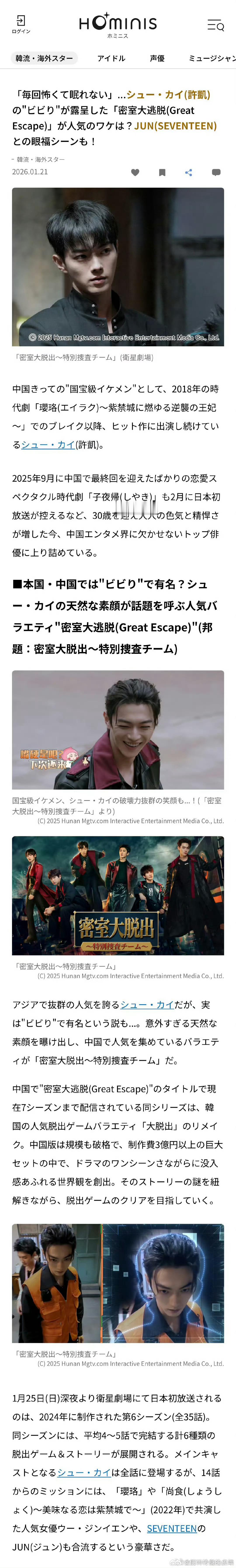 许凯密室大跳脱出口🇯🇵,国内唯一出口🇯🇵的综艺,还买了《子夜归》一起播出,【 播出确认】1️⃣许凯 主演的《子夜归》将于2月在日本播出。2️⃣此外,由许凯主演的综艺节目《密室大逃脱~特别调查组~》也将于1月在日本播出。