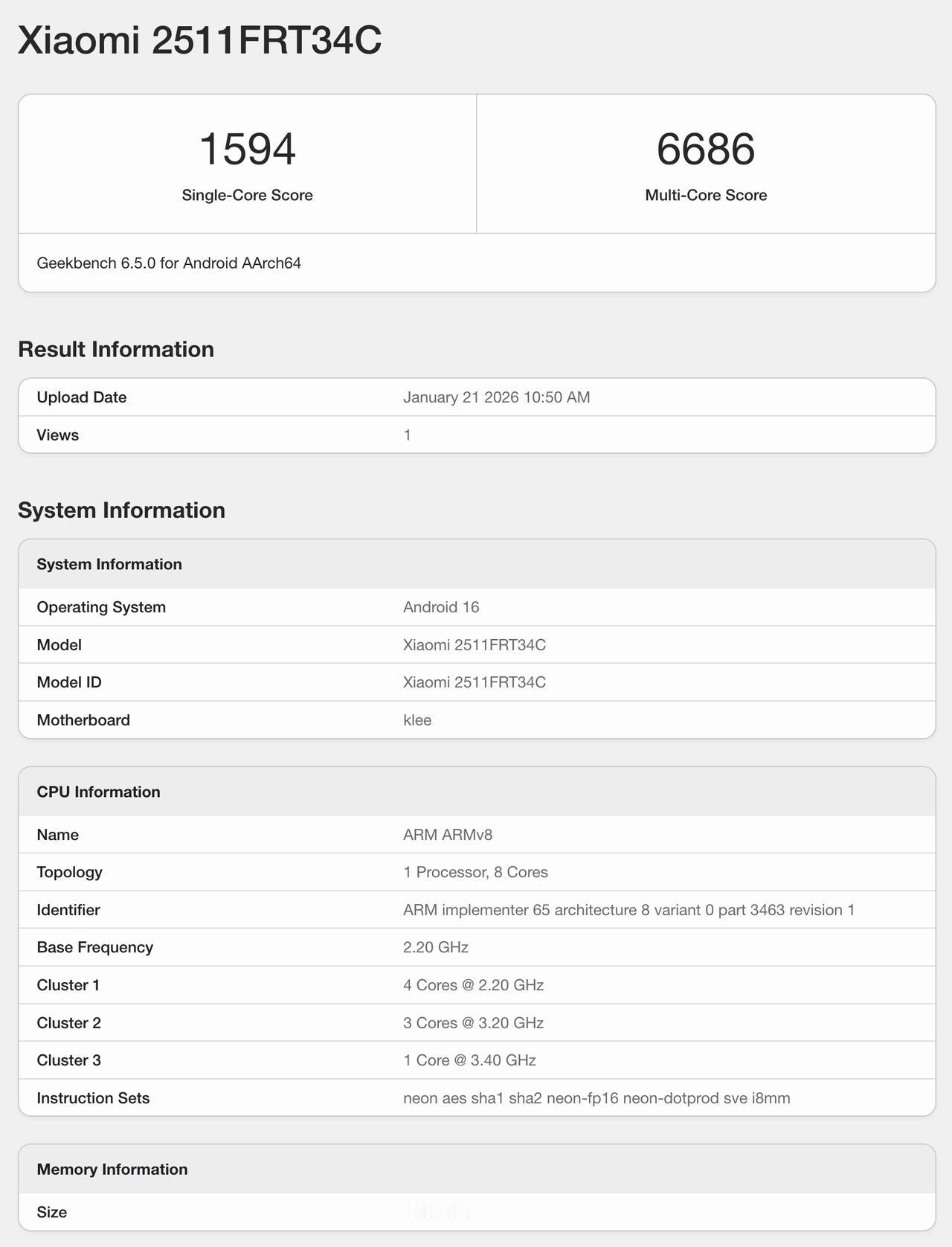 REDMI Turbo 5 标准版登上 Geekbench 6 官网,型号 2511FRT34C,新机搭载联发科天玑 8500 处理器,单核 1594 分,多核 6686 分。 Turbo 5 Max 定位 2500 价位,那么 Turbo 5 自然是坚守 2000 元价位了,等月底的正式售价。[吃瓜群众]