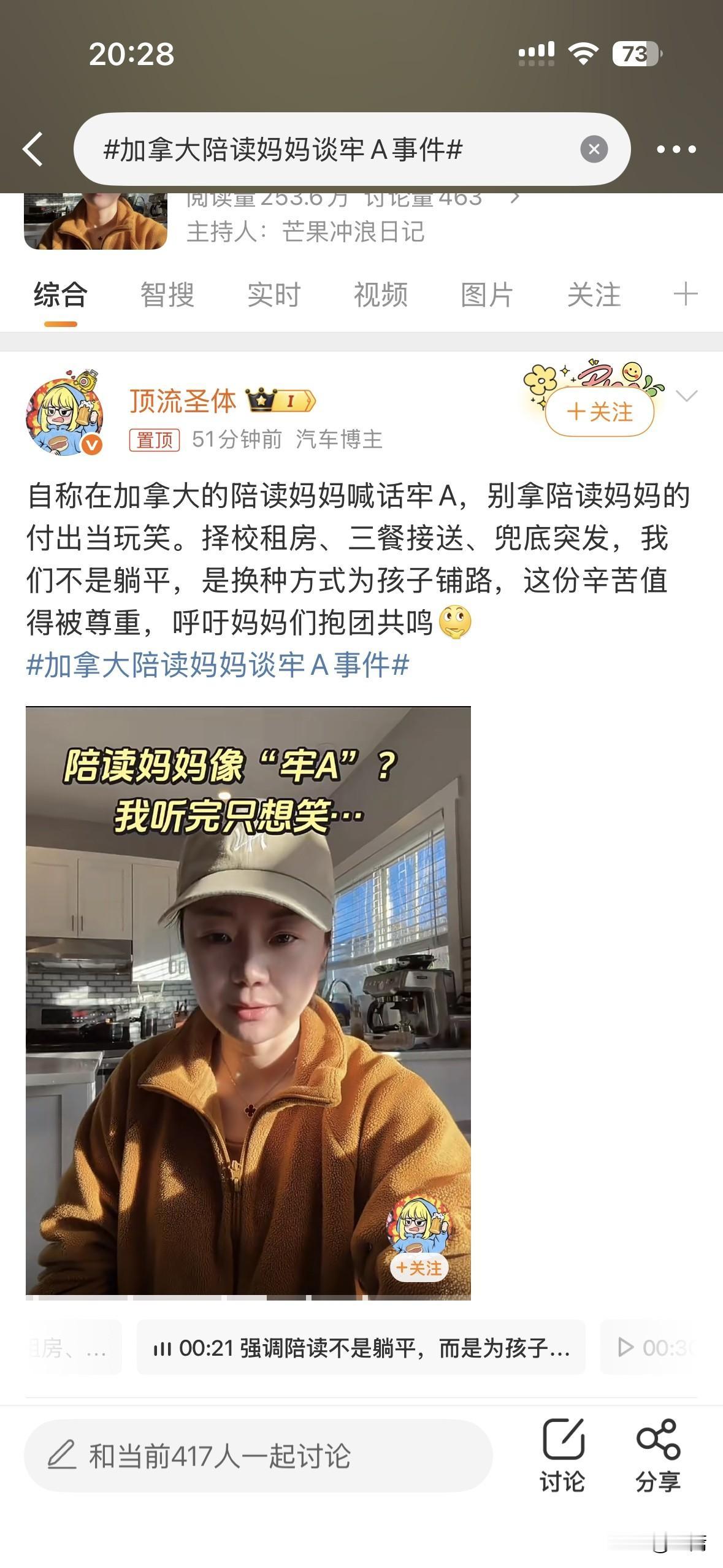 牢a说陪读妈妈的事,他说很容易被本地人顶上,很容易让孩子爹人财两空,陪读妈妈在那边人生地不熟语言不通,容易被下手,抵不住诱惑,从而走上了不归路。 当然了,也会有高知妈妈陪孩子读书,他们懂英语,也有自己的一套逻辑,不会掉入陷阱中,这种可能就是少数了。 牢a更想是保护好孩子爹,不想孩子爹在外赚钱,自己的后宅着火,他的付出 竹篮打水一场空。 不出意料的,就有一个加拿大陪读妈妈站出来,反驳牢A,认为他把陪读妈妈污名化,是一种偏见,不要看不到陪读妈妈的付出和辛苦。
