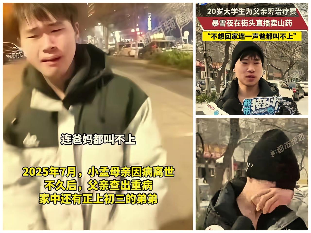 “太心酸了!”河南郑州,一20岁男生,大雪夜直播卖山药,冻得直搓手,本以为是作秀博流量的,结果男生却强颜欢笑说:“父亲得了重病想筹款,家里还有个上初三的弟弟。”网友问起母亲,坚强的男生却一下子哽咽了。 深夜郑州,雪落无声。昏黄路灯下,二十岁的少年独自直播——屏幕那端是万千陌生人,身后堆着自家种的山药。他跺脚取暖,手指通红,却始终微笑:“爸爸病了,弟弟要中考,我得撑起这个家。”话音落下,评论区静默了片刻。这不再是寻常的带货直播,而是一个年轻人与命运的交锋。 大三学生小孟,去年夏天刚送别母亲,这个冬天又迎来父亲的重病的噩耗。生活未曾给他喘息之机,却让他一夜之间褪去青涩,成为弟弟的依靠、父亲最后的屏障。那些深夜里的坚持,那些笨拙却真诚的舞蹈,不过是为了让亲人多一份希望。 当许多同龄人还在享受青春时,他已踏上为生活奔波的征途。这份担当背后,是一个青年最朴素的心愿:守住这个家,留住一声“爸爸”。没有怨天尤人,没有自怨自艾,只有行动与坚守——这份静默的力量,远比千言万语更能触动人心。 然而,这样的故事不应只停留在感动。每一次“寒门孝子”的新闻背后,都值得思考:我们的社会支持系统是否足够健全?如何在感动之余,建立更有效的帮扶机制?个人的坚韧固然可贵,但一个温暖的社会应当让每个努力生活的人都不再孤军奋战。 如果你也被这份深夜里的坚持所触动,不妨问问自己:我们可以做些什么?或许不是捐款,而是一份关注、一次转发,甚至只是将这份温暖传递给更多人。生活难免风雪,但人与人之间的微光,足以照亮前行的路。 你身边是否也有这样在逆境中依然闪光的普通人?他们的故事如何改变了你的认知?