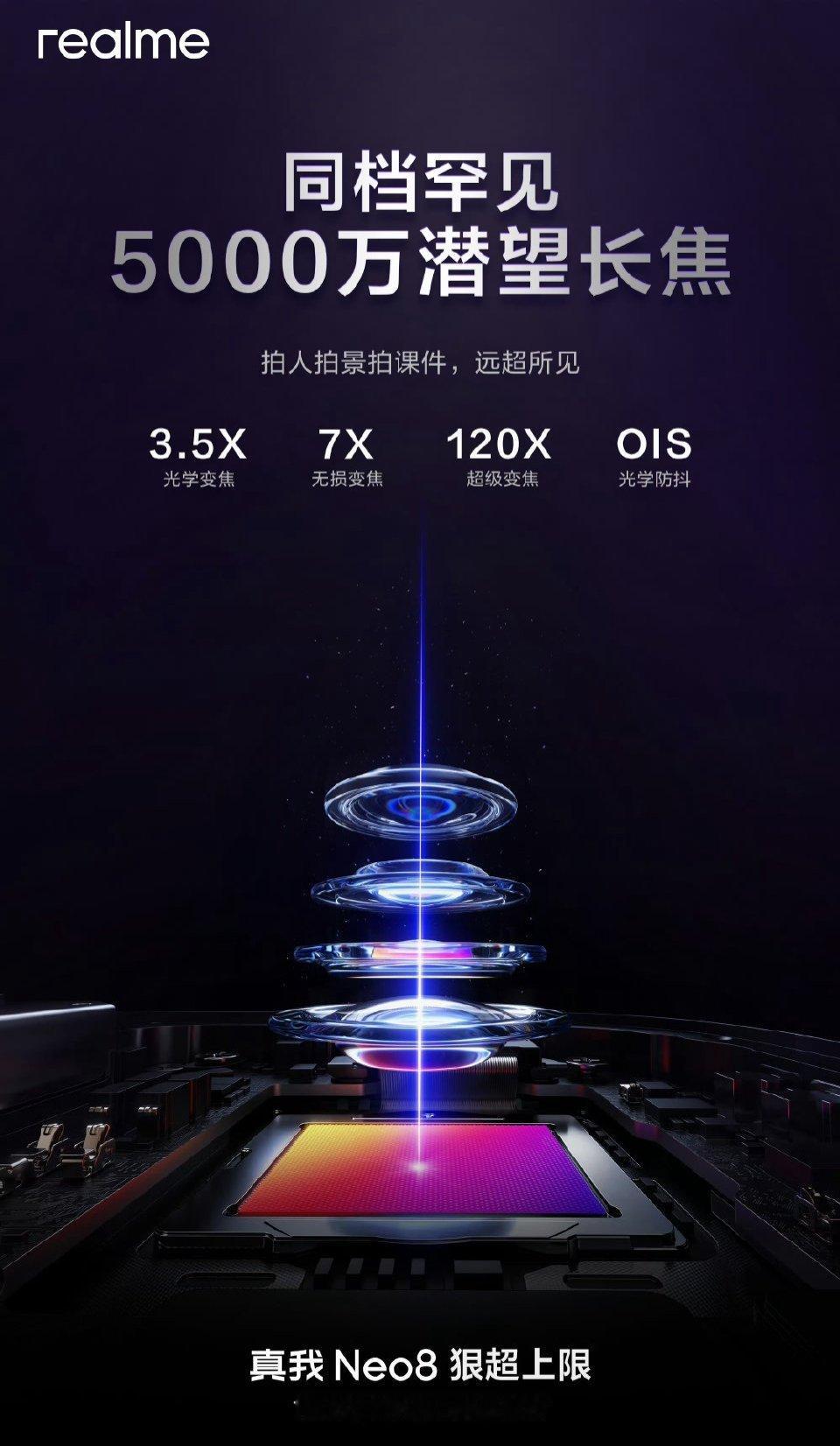 真我 Neo8 上了 5000 万像素潜望长焦,支持 3.5 倍光学变焦,7 倍无损变焦,120 倍远距变焦,OIS 光学防抖,看起来应该是索尼 LYTIA 600。年初这波 2500 价位唯一一款配备潜望长焦的机型,你觉得这个价位有没有必要配长焦?