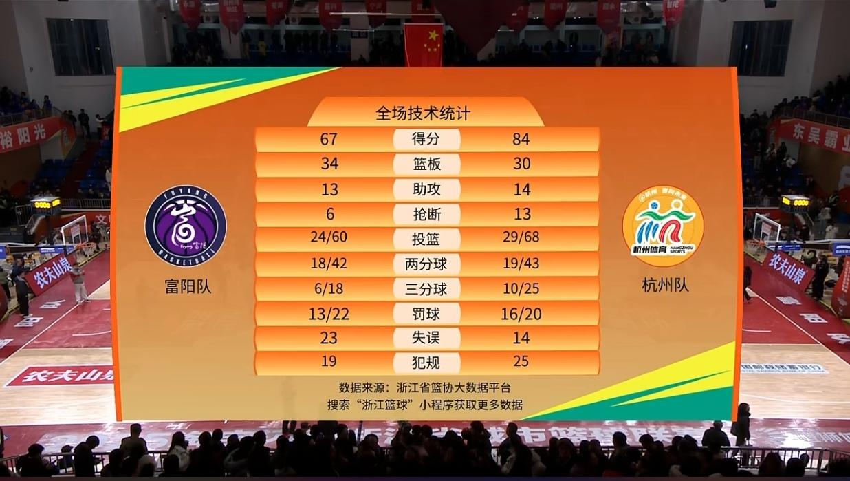 即使不甘,终究还是需要面对“富阳队67:84”主场不敌杭州队。 希望章佳飞在下一场与杭州对决时能正常出场。