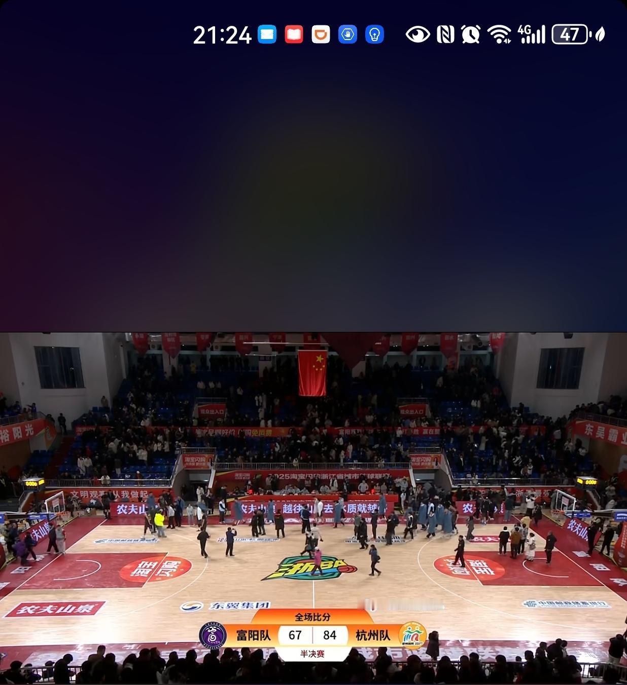浙BA联赛半决赛,富阳队主场迎战杭州队,第一节结束富阳队18:20落后2分。 期