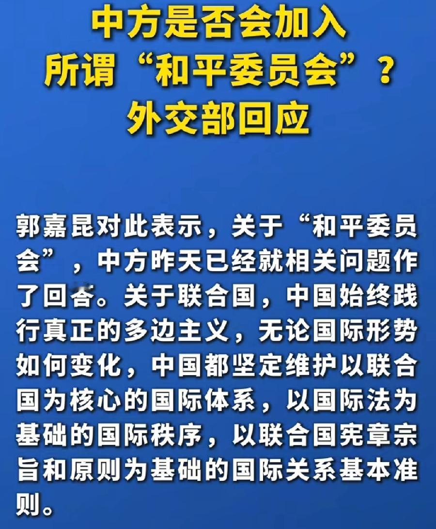 中国回应是否加入特朗普“和平委员会”,回答回旋余地很大!到时根据综合形势变化,最后再作出最佳决策!因为中国处理国际事务的原则,一直都是和平相处,追求和平,无论加沙、乌克兰还是其它地区,只要有利于和平的事,中国都愿意积极参与!但是特朗普这个和平委员会刚提出来,到底真假如何、具体啥情况,都还不清楚,所以火速急着表态是最差选择!