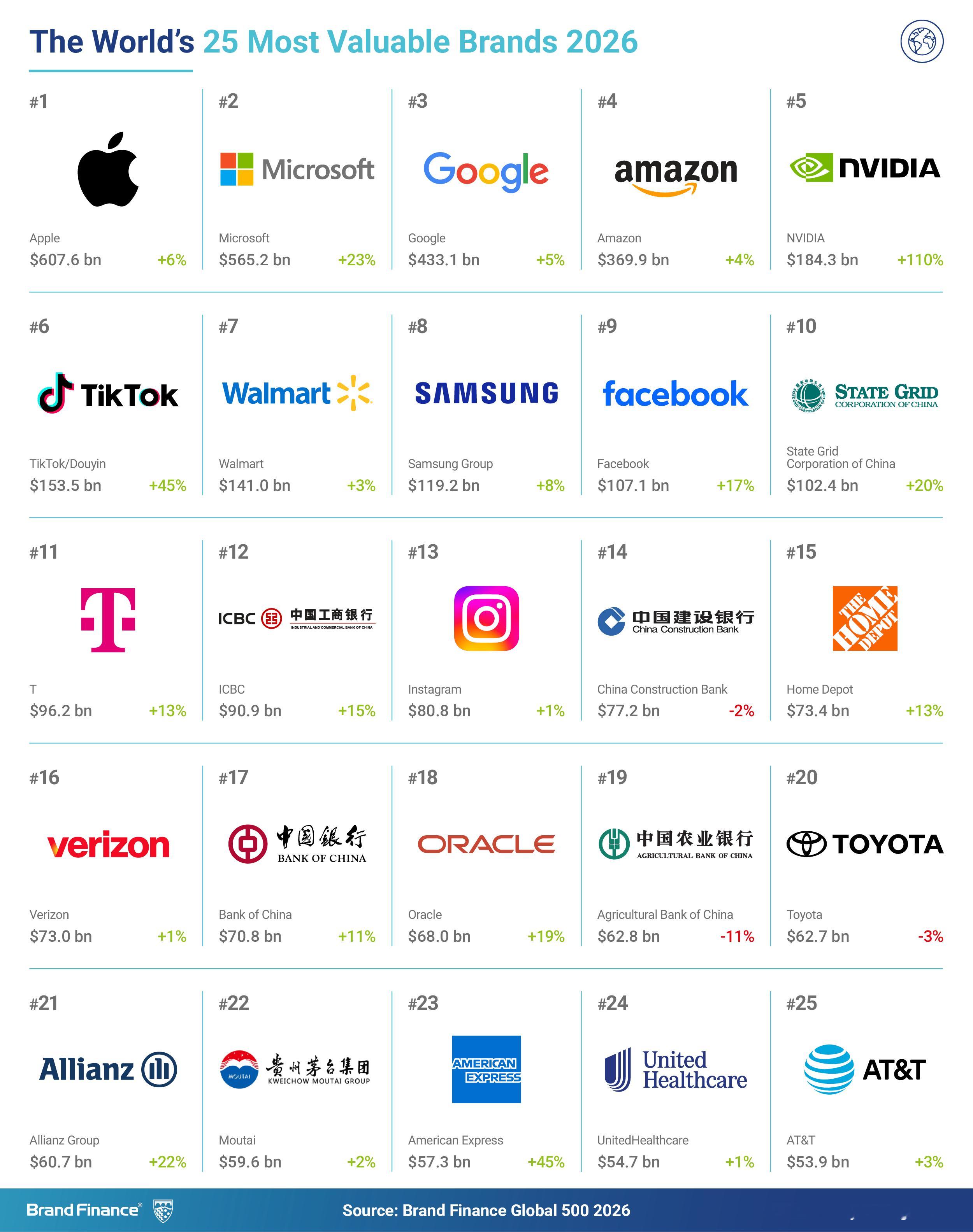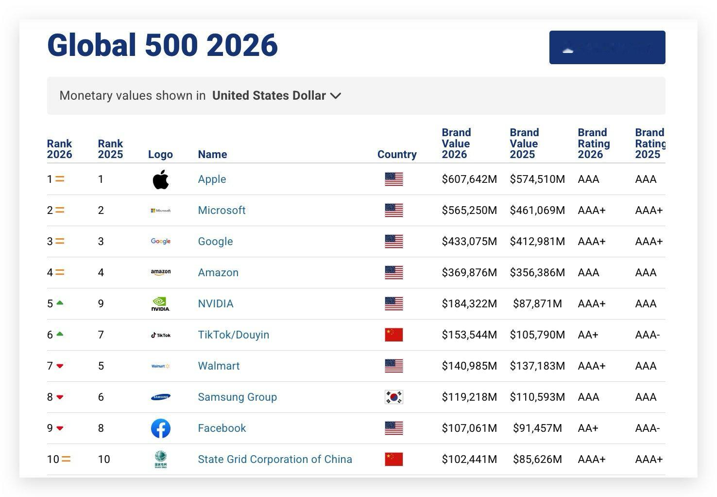 Brand Finance《2026年全球品牌价值500强榜单报告》●美国192个品牌入选,贡献全球品牌总价值的53.4%●中国68个品牌位居第二,占比达15.1%,抖音品牌价值最高●苹果仍然是全球最具价值的品牌●NVIDIA 在品牌价值上超越 Facebook 和沃尔玛●OpenAI 首次进入全球 500 强●YouTube 被加冕为全球最强品牌