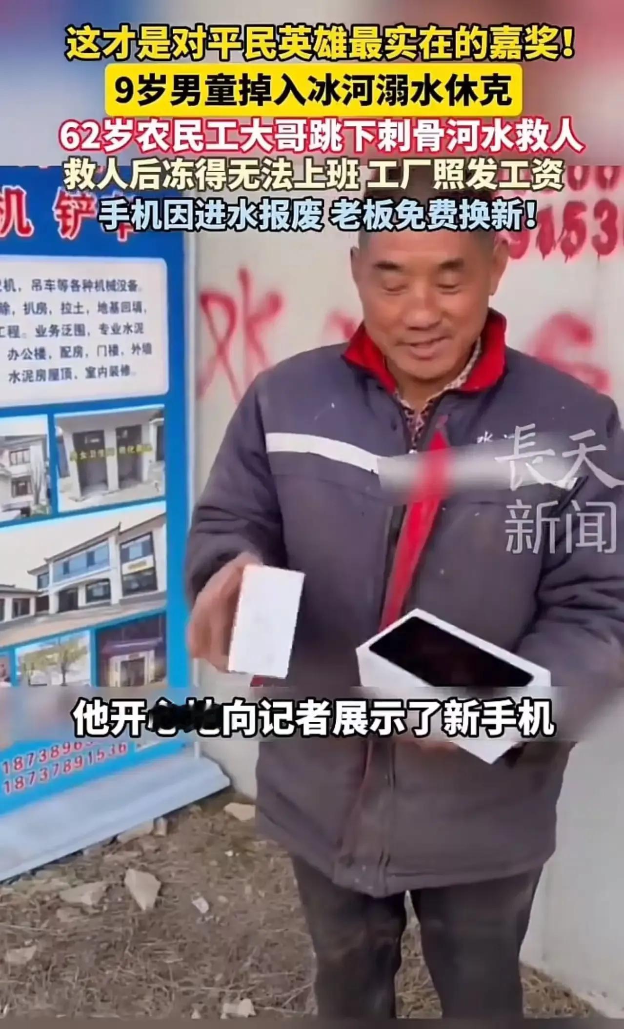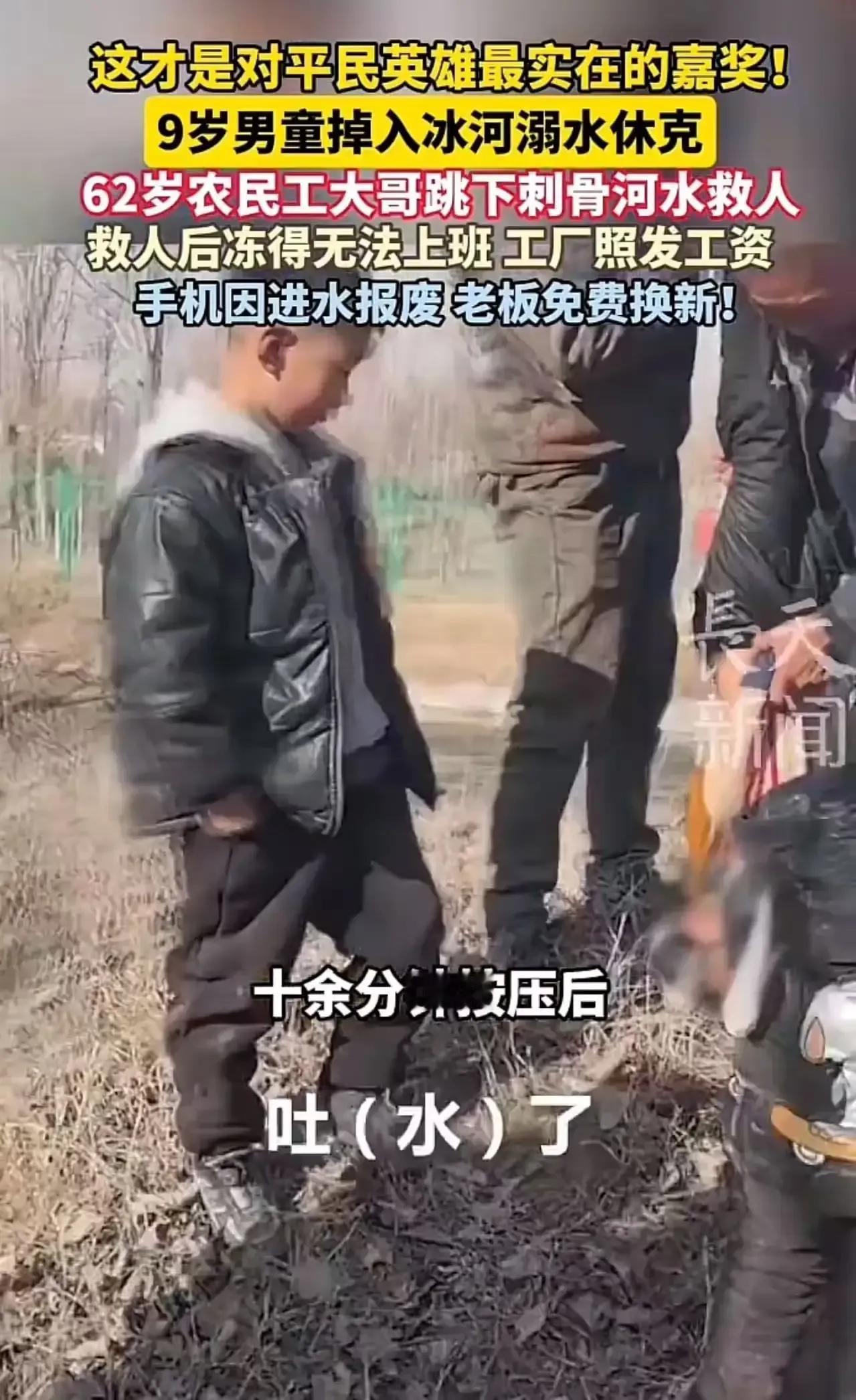 “这才是对平民英雄最实在的嘉奖!”9岁男孩冰河溺水,62岁农民工跳入刺骨河水救人,冻到无法上班,老板却说:“工资照发,手机我赔!”全网怒赞:这个老板真有格局! 就在这个平凡的瞬间,折射出的是人性最温暖的一面。或许有人会觉得,这不过是一场普通的救援,但细细想来,这背后隐藏的,是社会最需要被传递的正能量。 当9岁的孩子在冰冷的河水中挣扎,谁第一个冲上前去?不是警察、不是救援队,而是一个62岁的农民工大叔。他没有犹豫,没有犹豫的理由,只因为那一刻,他看到了生命的价值,看到了一个小生命的渴望。用他的行动告诉我们,善良从不分年龄,也不分身份。或许他只是一名普通的农民工,但在那一刻,他成为了真正的英雄。 更令人感动的是,救人者的老板——那位普通的工厂老板。面对突如其来的救援,他没有问责,没有责怪,只是说:“工资照发,手机我赔!”这句话,像是一股清流,冲破了社会的浮躁与冷漠。它让我们看到,真正的企业责任感,不是单纯追求利润,而是懂得在关键时刻伸出援手,守护员工的生命安全。这种格局,远比金钱更有价值。 这件事在网络上引发了热烈的讨论。有网友说:“这个老板的胸怀,比那些高高在上的企业家还要宽广。”也有人感慨:“农民工大叔的勇气,才是真正的英雄。”更多人则在评论中表达了对善良的敬意和对社会正能量的期待。 我们常常会陷入对“英雄”的刻板印象,总觉得他们是那些披着斗篷、站在聚光灯下的人。而实际上,真正的英雄,可能就是你我身边的普通人。他们用行动诠释了“善良”与“责任”,让这个社会变得更加温暖。 也许我们都应该问问自己:在遇到困难和需要帮助的时候,我们能否像那位农民工大叔一样,勇敢地迈出那一步?在面对不公和冷漠时,我们是否也能像那位老板一样,展现出大格局的胸怀? 这不仅仅是一场救援,更是一堂关于人性、责任和爱的生动课程。它告诉我们,英雄并不遥远,他们就在我们身边,只要我们愿意伸出手,就能点亮一片希望的天空。让我们一起为这些平凡而伟大的“英雄”点赞,也希望这样的故事,能在更多人心中生根发芽,成为推动社会前行的正能量!救人男孩遇难