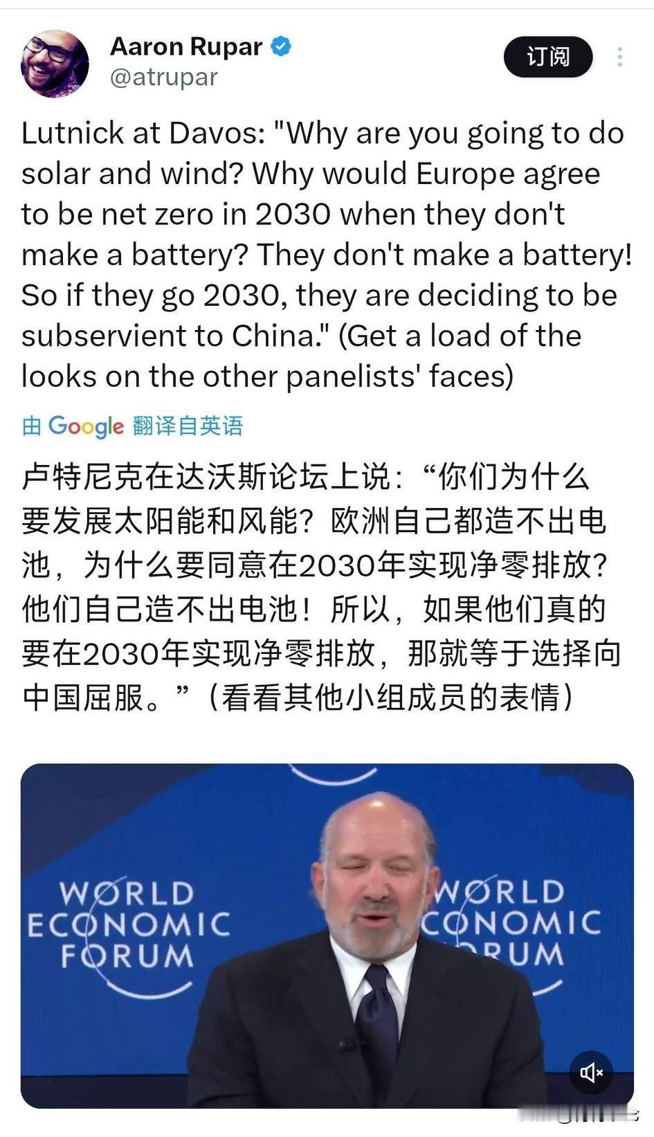 因擅自做主而被特朗普排除在谈判圈在的美国商务部长卢特尼克在达沃斯论坛上又大放厥词,他嘲笑了欧洲盟友的无能,还无中生有地提到了东大。卢特尼克的这番发言受到了同台嘉宾的“吃惊”式回应,同台嘉宾心里肯定在想,“神经病”!不过,卢特尼克这次应该不会受到特朗普的批评,因为特朗普现在也把枪口对准了欧洲,欧洲领导人们毫无原则地屈从特朗普却换来了特朗普及其团队的嘲讽,欧洲真是可悲!