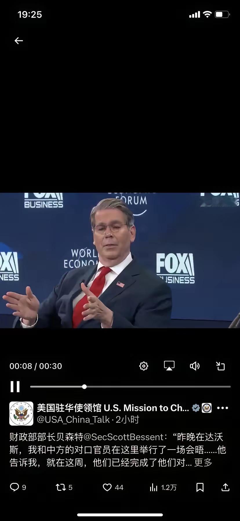 美国驻华使领馆今天(1月21日)写道:“财政部部长贝森特说:“昨晚在达沃斯,我和