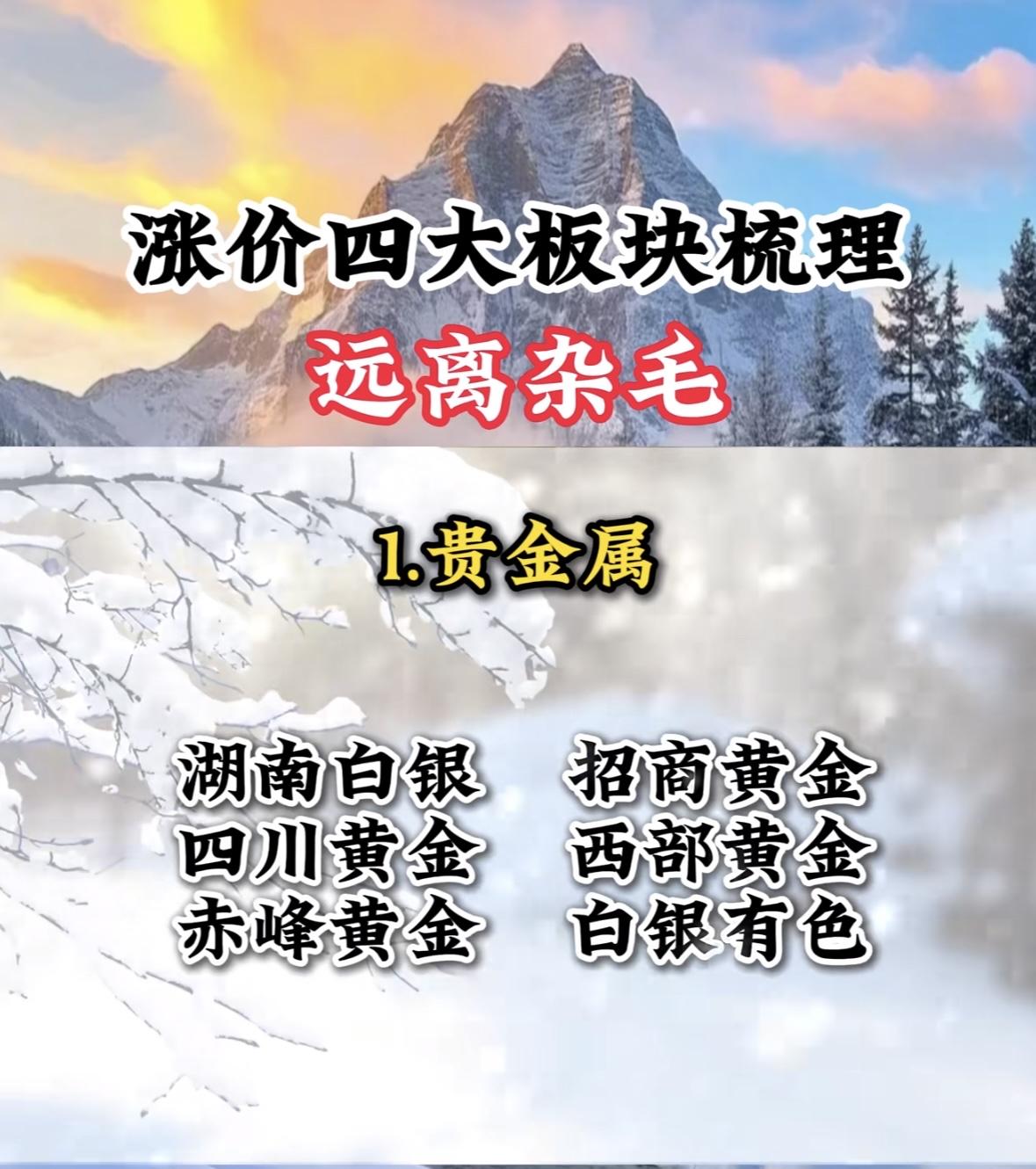 四大涨价板块梳理,远离杂毛,精选化工原料股! "贵金属板块走强,湖南白银、四川黄金领涨,赤峰黄金等跟风上扬,投资聚焦龙头避杂毛。"