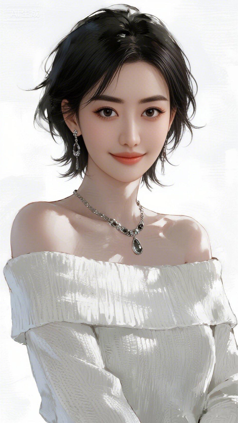 精致东亚女性,眼尾细长睫毛纤长,黑色凌乱短发,穿白色一字肩毛衣,戴耳环项链,俏皮