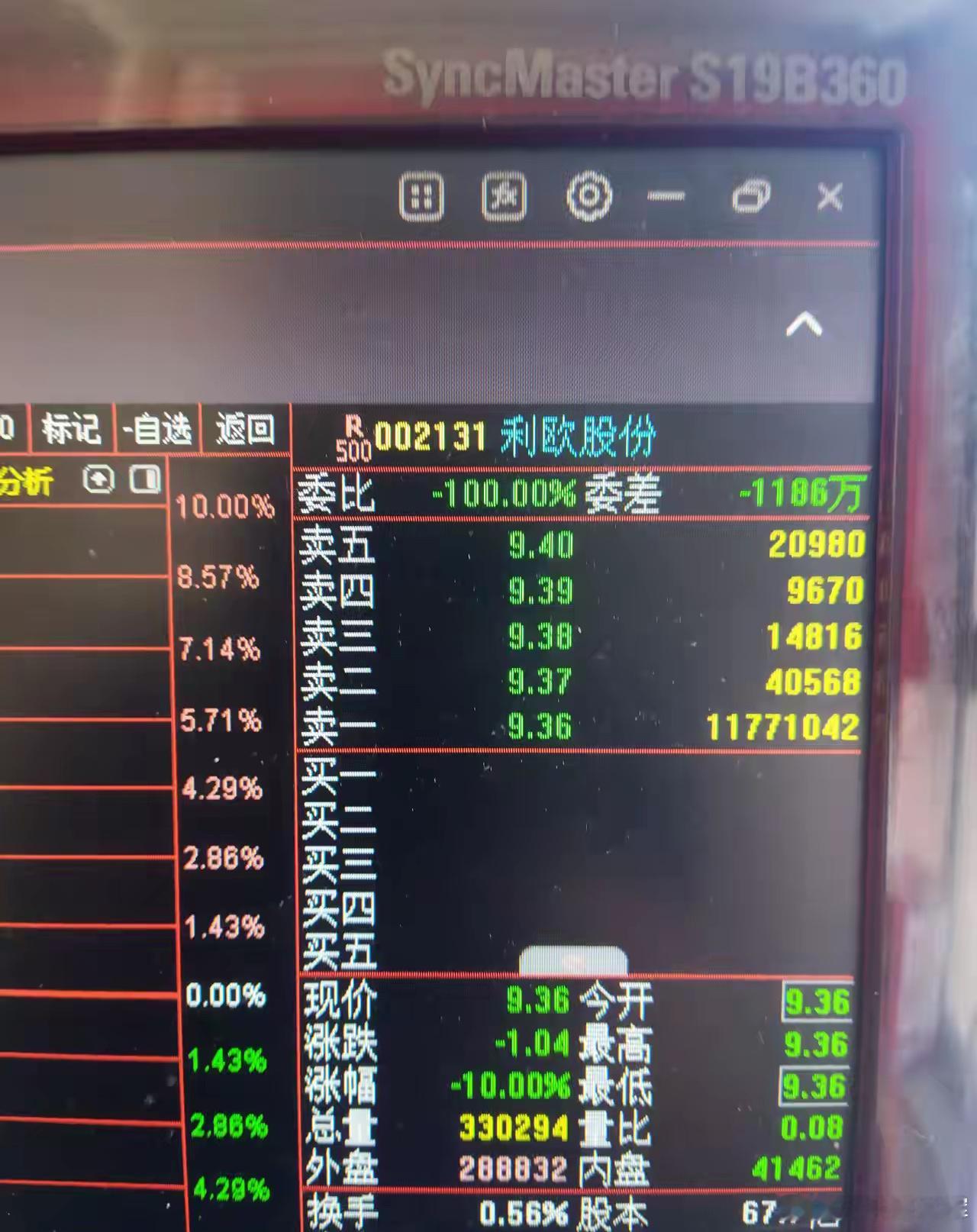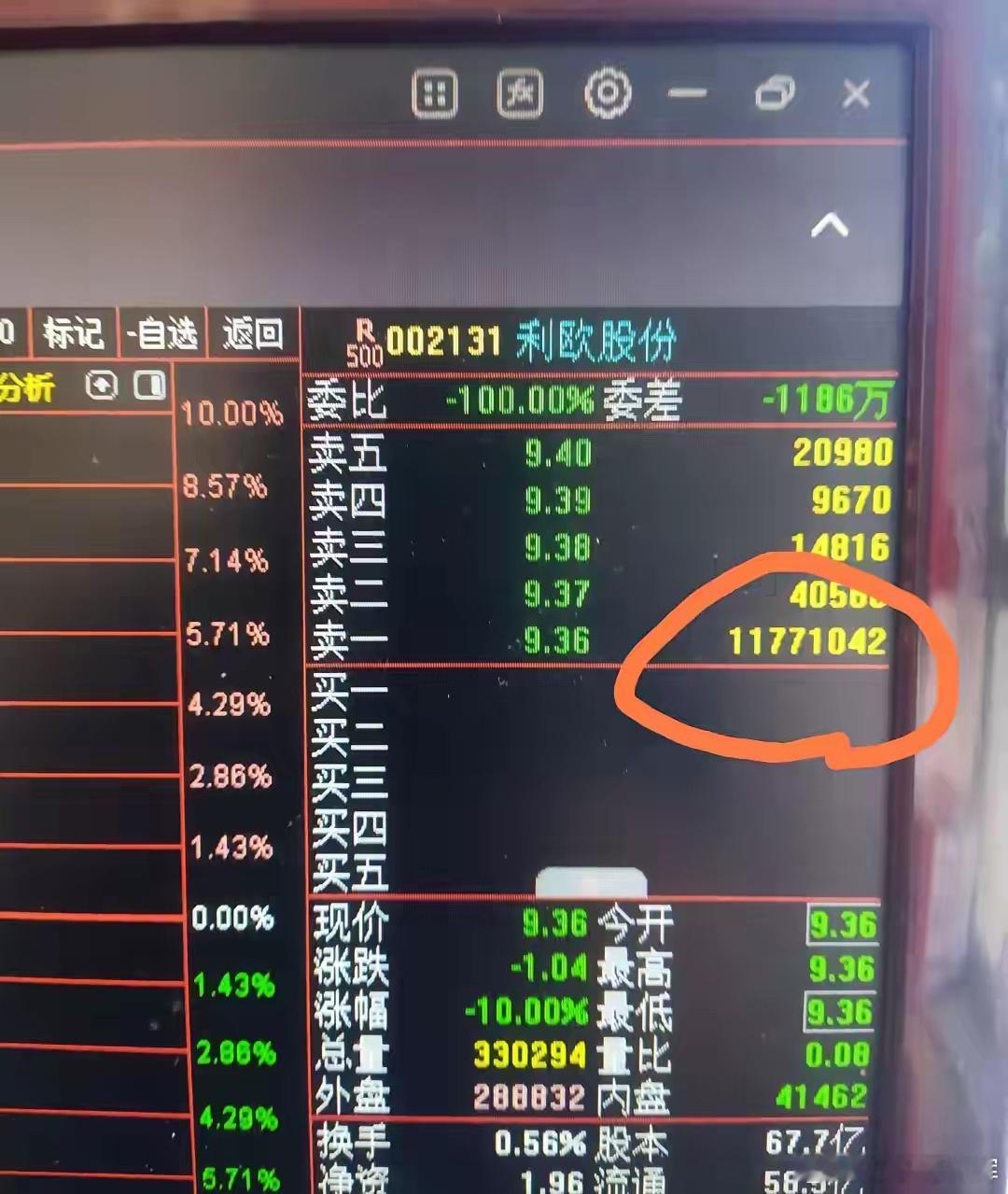 见证A股历史!利欧股份11771042手封死跌停,110亿抛压挤进近十年前三!A股今天炸出惊天名场面!利欧股份(002131)卖一位置直接被11771042手卖单焊死,换算成股数是足足11.77亿股,以9.36元的跌停价计算,封单金额高达110亿元!这个数字有多恐怖?我们直接拉历史数据对标——近十年A股跌停封单金额排行榜上,2016年万科A股权之争时的171亿元封单稳居第一,2018年乐视网债务危机爆发的117亿元封单位列第二,利欧股份这110亿元,硬生生挤进前三甲!要知道利欧股份总市值才330.29亿元,110亿封单相当于三分之一的市值抛压集中砸出,盘口委比直接干到-100%!持股的散户根本没机会出逃,想抄底的资金看这架势也不敢伸手,盘面彻底成了空头的“一言堂”。回顾A股历史,万科A171亿封单后股价持续调整,乐视网117亿封单更是开启了漫漫跌停路。这种天量封单的背后,要么是突发利空引发的恐慌踩踏,要么是大资金之间的极端博弈,但不管是哪种情况,对咱们散户来说都是高危预警!记住一句话:天量封单不抄底,流动性锁死易深套!哪怕盘面看着跌到位了,也得等抛压释放完毕、资金主动进场再说,守住本金比啥都重要。敬畏市场永远是第一位!每一次天量封单,都是市场给我们上的沉重一课。把它加入你的投资记忆库,未来就是判断风险的一把尺。如果这份复盘让你在震荡市中多了一份清醒,点赞即是鼓励。 关注我,持续拆解极端行情,一起做更冷静的市场观察者。【风险提示:以上仅为历史数据梳理,不构成投资建议。股市有风险,决策需谨慎。】