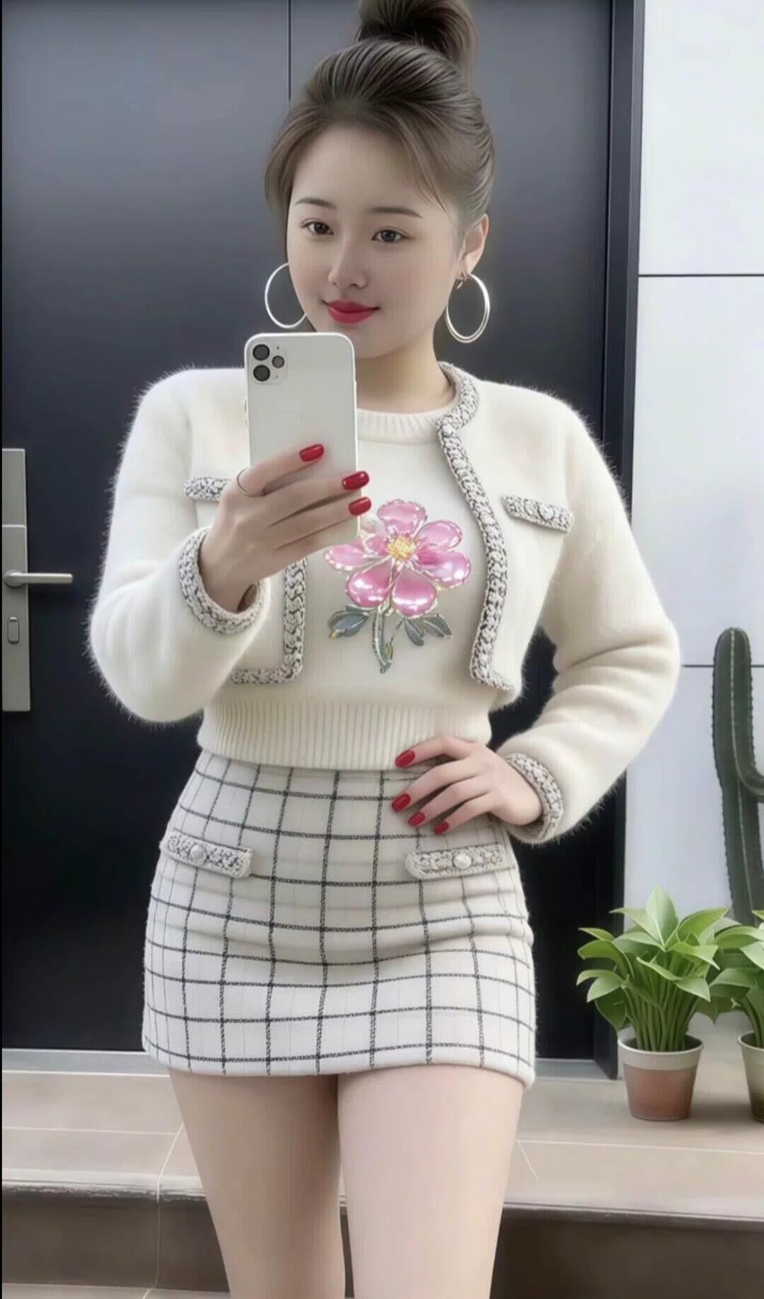 甜美少女风穿搭,粉色花朵毛衣搭配格纹短裙,元气满满!🌸👗💄