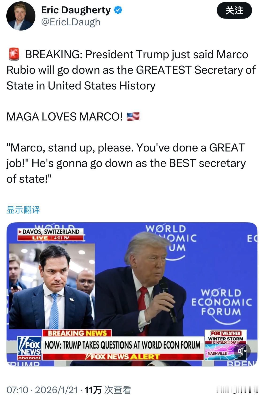 突发新闻:特朗普总统刚刚表示,马可·卢比奥将成为美国历史上最伟大的国务卿。 MAGA 超爱马可! “马可,请站起来。你做得太棒了!他将会成为史上最伟大的国务卿!”