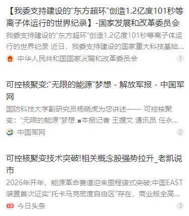 一旦美、中、俄之一率先掌握核聚变可控技术,后果会有多可怕?就这么说吧,谁要是真掌握了,绝对是下一个世界霸主,别人还无法赶超的那种。 麻烦看官老爷们右上角点击一下“关注”,既方便您进行讨论和分享,又能给您带来不一样的参与感,感谢您的支持! 在人类科技发展的赛道上,从来没有哪项技术能像可控核聚变这样,一旦突破就可能彻底改写世界格局。这种模仿太阳内部反应的新型能源技术,堪称 “终极能源解决方案”,谁能率先解锁它的可控密码,谁就等于握住了未来世界的钥匙,这种领先优势绝非以往任何技术革命能比拟,甚至会形成难以逾越的代差。 可控核聚变的核心魅力在于其近乎无限的潜力。它的原料氘藏在海水中,仅地球上海水含有的氘,就能支撑人类用上百亿年,而氚可通过锂反应制取,同样储量丰富。更关键的是,它反应安全,一旦条件不达标就会自动终止,不会产生核泄漏风险,产物也只有无污染的氦气,完美契合碳中和的全球需求。 在这场全球竞速中,中国的表现格外亮眼。依托 “东方超环”(EAST)全超导托卡马克装置,中国科研团队不断刷新世界纪录,先后实现 1.2 亿度等离子体稳定运行 101 秒、1.6 亿度运行 20 秒的惊人成绩。这些突破背后,是对稳态高功率加热、高精度等离子体控制等一系列技术难题的攻克,让中国在稳态高参数磁约束聚变研究领域稳稳站在了国际前沿。 2026 年开年,中国可控核聚变领域再传捷报。EAST 装置首次证实 “托卡马克密度自由区” 存在,为聚变能经济性奠定了核心物理基础,而商业版全高温超导托卡马克 “洪荒 70” 实现 120 秒稳态长脉冲运行,标志着技术从实验室向产业化迈出关键一步。同期《中华人民共和国原子能法》正式施行,从法律层面为可控核聚变研发保驾护航,万亿级能源赛道被全面激活。 一旦这项技术实现商业化应用,首先震动的就是全球产业格局。钢铁、化工这些高耗能产业,将彻底摆脱对化石能源的依赖,生产成本大幅降低,现有的产业链条会被重新洗牌。那些依赖能源出口的国家,其经济支柱可能会受到冲击,而掌握技术的国家将凭借低成本优势,在全球贸易中占据绝对主导地位。 军事领域的变革同样颠覆性。可控核聚变装置小型化后,能为航母、大型运输机提供源源不断的动力,大幅提升其航程和运载能力。激光武器、电磁炮这些新概念武器,将不再受限于能源供应,全电化作战成为现实,战场后勤保障压力显著降低。更重要的是,它能推动太空军事化进程,让航天器获得持久动力,星际航行和太空部署的想象空间被彻底打开。 技术垄断带来的连锁反应会进一步巩固领先地位。核心设备制造、高温超导材料等关键领域的技术壁垒,会让后发国家难以追赶。像中国的永鼎股份、西部超导等企业,已在超导材料领域打破国外垄断,这种全产业链的协同创新,会形成 “技术领先 — 产业成熟 — 规则制定” 的良性循环,最终让掌握技术的国家掌控全球能源输出和经济规则。 国际能源署预测,到 2030 年全球核聚变市场规模有望接近 3.5 万亿元,2040 年将增至 8435 亿美元,到 2100 年聚变能在全球电力结构中的占比将达 27%。如此庞大的市场体量,会吸引海量资本和人才涌入,进一步拉大技术差距,形成 “赢者通吃” 的局面。 但可控核聚变终究是全人类的福祉,而非某个国家的专属。如果领先国家能开放合作,共享技术成果,将为应对全球气候变化提供核心支撑,大量替代化石能源后,温室气体排放会大幅减少。同时,低成本能源能助力发展中国家加速工业化,缩小全球发展差距,让人类文明实现整体跃升。 目前,全球可控核聚变研究仍处于攻坚阶段,美国的国家点火装置、欧洲的 JET 装置都在不断取得进展,“50 年悖论” 虽仍未打破,但技术突破的节奏明显加快。中国在磁约束聚变领域的领先,并不意味着最终胜利,这场关乎人类未来的科技竞赛,还存在诸多变数。 不过可以肯定的是,谁能率先跨过商业化的门槛,谁就将成为新时代的引领者。这种领先不是暂时的,而是基于能源革命的代际优势,就像工业革命让英国崛起、信息技术让美国领跑一样,可控核聚变带来的,将是更深远、更持久的全球格局重塑。 当然,技术的终极意义是造福人类。希望未来掌握这项技术的国家,能摒弃零和博弈的思维,通过国际合作让聚变能惠及每一个国家。毕竟,当人类能够驾驭 “人造太阳” 的能量时,更应该迈向的是共同发展的星际时代,而不是相互隔绝的霸权格局。这项技术的 “可怕” 之处,既在于其颠覆性的影响力,更在于它考验着人类的智慧和格局 —— 是用它划分界限,还是用它搭建桥梁,将决定人类文明的未来走向。 信息来源:中华人民共和国国家发展和改革委员会,《我委支持建设的“东方超环”创造1.2亿度101秒等离子体运行的世界纪录》