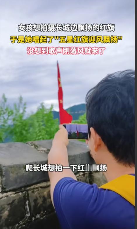 彻底解释不清了!北京,一女子去长城游玩时,突然看到一面五星红旗,就拿出手机想记录下,期间情不自禁的唱起了《歌唱祖国》,不料,唱着唱着红旗竟飘起来了,女子顿时激动的想哭,网友:为什么看到的我热泪盈眶! 这面国旗是彻底"成精"了!眼看女子只是随口哼唱《歌唱祖国》,谁料刚唱到高潮部分,原本一动不动的五星红旗突然迎风飘扬,女子当场眼眶湿润,网友直呼:隔着屏幕都破防了!然而,这看似偶然的巧合背后,其实深埋着独属于华夏儿女的那份极致浪漫,越品越有味道。 定位之地,正是北京古长城。那古老城墙宛若蜿蜒巨龙,盘踞于山峦之上。它承载着岁月沧桑与历史厚重,如一位沉默老者,静静诉说往昔故事。正值暑假,彭女士携子登高,行至半山腰处暂歇,不经意间仰头,赫然发现高处的枝桠间悬挂着一面鲜艳的国旗。 苍穹湛蓝,古墙巍峨,那一抹中国红显得分外耀眼,直击人心。她本能地掏出手机欲定格这帧画面,谁承想,镜头才刚聚焦,那首早已融入血脉的《歌唱祖国》旋律,便不由自主地从唇齿间流淌而出。 起初不过是低声轻和,可当唱至“五星红旗迎风飘扬”这句高潮节点时,令人称奇的一幕出现了! 原本静垂不动的旗帜,仿佛听懂了召唤,骤然间随风招展,歌声与风声交织,红旗伴着旋律起舞。 目睹此景,彭女士擎着手机的双手止不住地颤抖,泪水瞬间决堤,就连身旁的稚子也受到感染,跟着轻轻哼唱起来。 这段视频未经任何修饰,甚至夹杂着呼啸的风噪,一经发布便引发全网共鸣,评论区瞬间沸腾。 有人感叹这是英灵对歌声的回响,有人惊呼万物皆有灵。有网友难抑激动之情:“谁能体会这份触动!当长城与国旗同框映入眼帘,刹那间,真切领悟了何谓中华脊梁。”” 归根结底,这种触动绝非矫揉造作,而是源于灵魂深处的文化认同。目光转向四川宜宾,90岁高龄的抗美援朝老兵练振炳,此生最大的夙愿便是再经历一次升旗仪式。当校方特意为其举行典礼,国歌奏响、红旗漫卷之时,老人身披满挂的勋章,颤颤巍巍地举手敬礼,口中喃喃道:“你们的幸福,是我们当年拼出来的。” 远赴德国求学的郭峰阳亦是如此,他不惜历经10小时长途飞行归国,在天安门广场苦守12个钟头,只为亲眼见证国旗升起的那神圣一刻。 而在伊朗撤侨行动中,华侨马正华带领同胞撤离险境,当目光触及口岸那面高举的五星红旗时,眼眶瞬间泛红:“看到它,就知道自己安全了。”携程最新数据显示,近一月投身红色旅游的人群里,90后与00后群体表现颇为亮眼,占比已逾半数,彰显着年轻一代对红色文化的热忱与传承。 于当代人而言,爱国绝非空泛口号。它是凝望国旗时,那股炽热滚烫、翻涌不息的热血;是聆听国歌时,那份油然而生、庄严肃穆的敬意。诚如一位网友所分享:“我爷爷亦是老兵,每当电视中奏响国歌,即便他腿脚已然不便,也定会扶着椅子颤颤巍巍地起身。”” 也有人留言:“去年在国外留学,看到使馆门前的国旗,突然就哭了,那是想家的感觉,也是踏实的感觉。”“不是矫情,是看到祖国越来越强,真的忍不住骄傲。” 那面旗帜,绝非仅是一方织物。它是老兵矢志不渝的信仰之光,是游子日夜萦怀的深切牵挂,更是我们心灵深处可依偎的温暖港湾。这万里长城也绝非仅是砖石堆砌的屏障,它默默记录了祖国从往昔的积贫积弱走向今日繁荣昌盛的壮阔征途。 当激昂的歌声与国旗相遇,当厚重的历史与当下碰撞,这种穿透时空的共振,便是独属于中国人的顶级浪漫。 信息来源:青春河北 2025-8-29