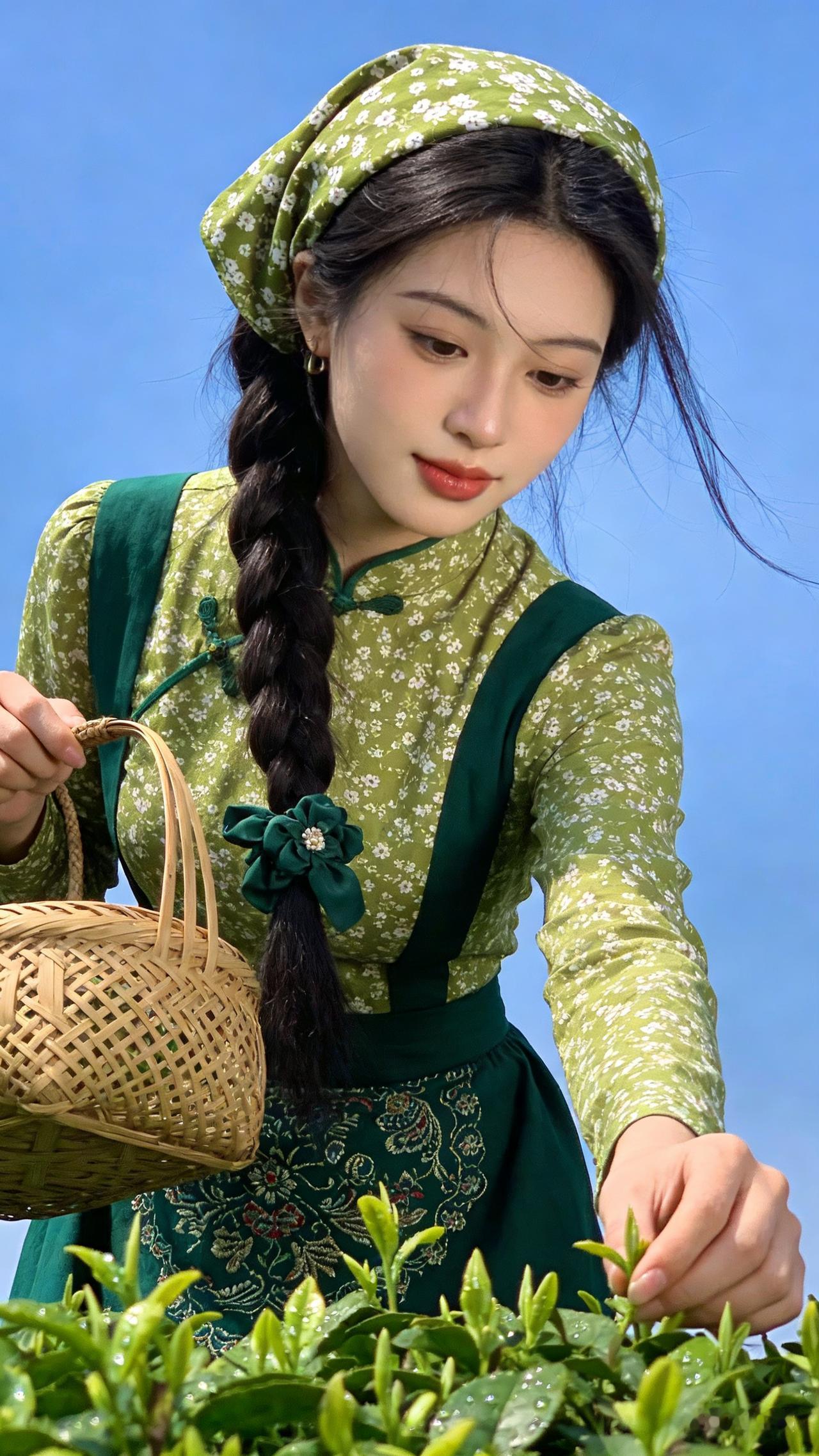田园人像,麻花辫系深绿花带的甜美女郎,牛油果绿碎花新中式上衣搭刺绣围裙,挎竹篮采露茶,浅景深衬澄澈蓝天,超精细,清新温婉。
