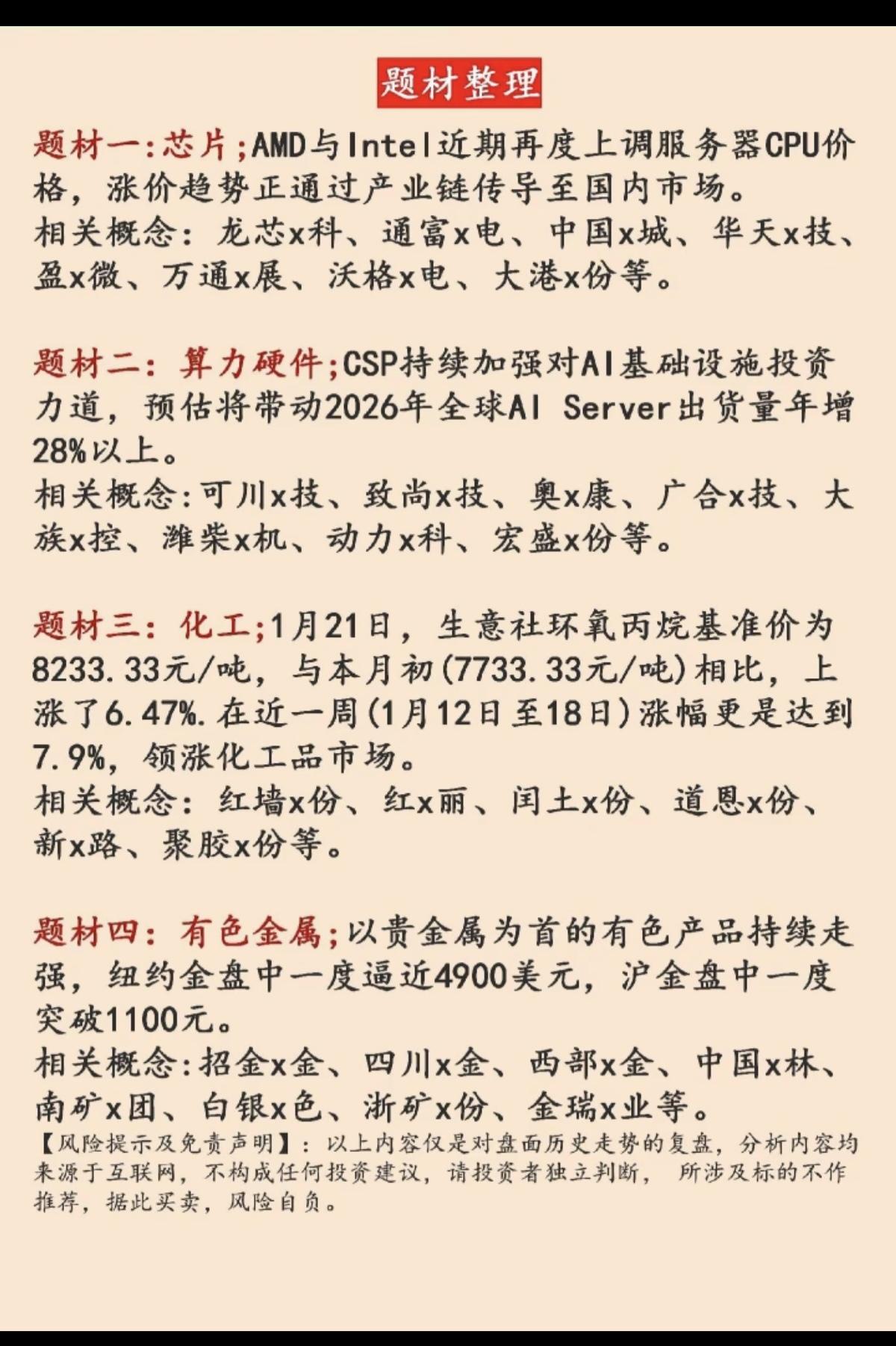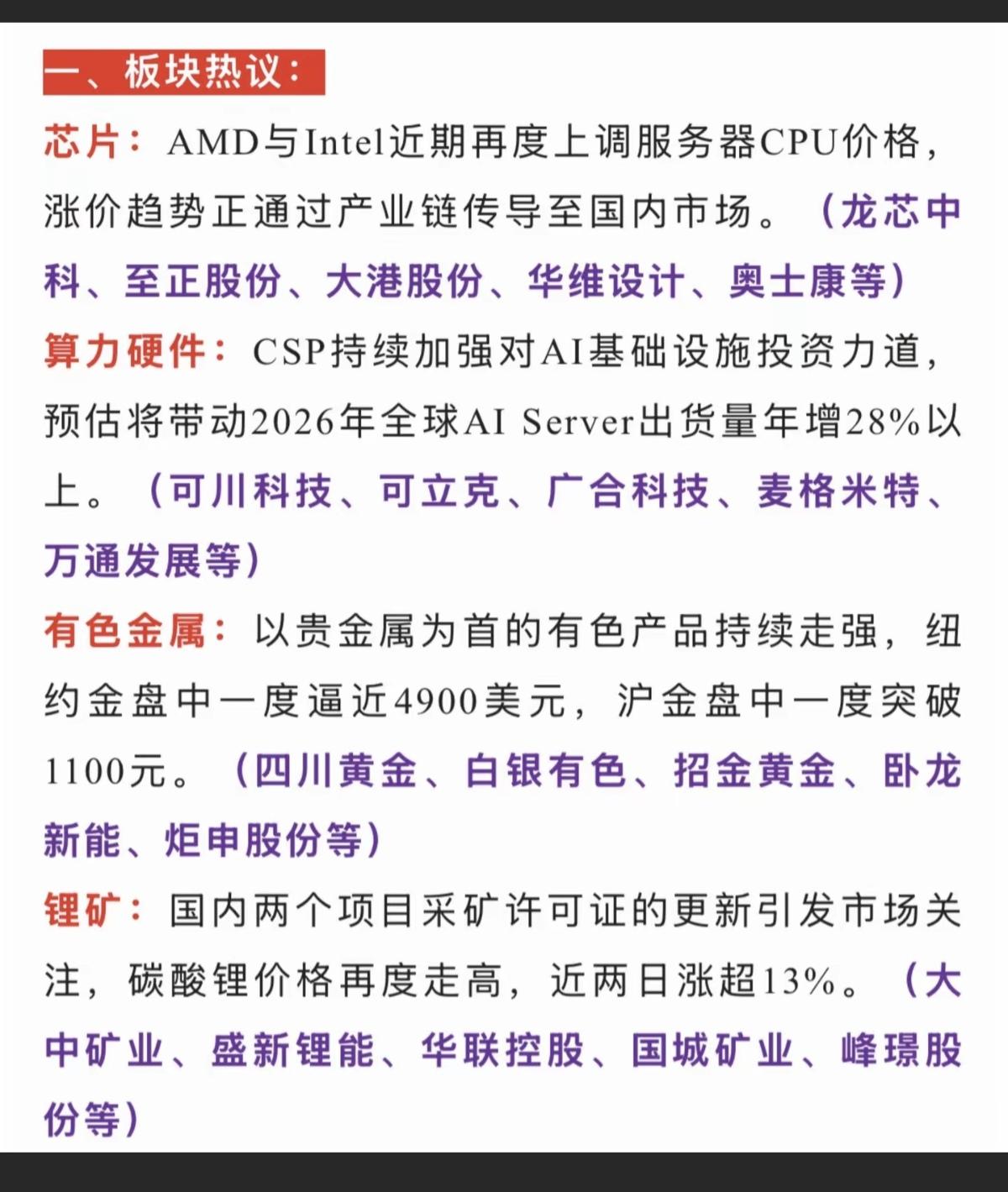 1.22周四 市场热点 题材前瞻! 一、芯片链+CPU涨价 二、算力硬件 三、化工原料涨价 四、有色金属、贵金属 五、锂矿,能源金属