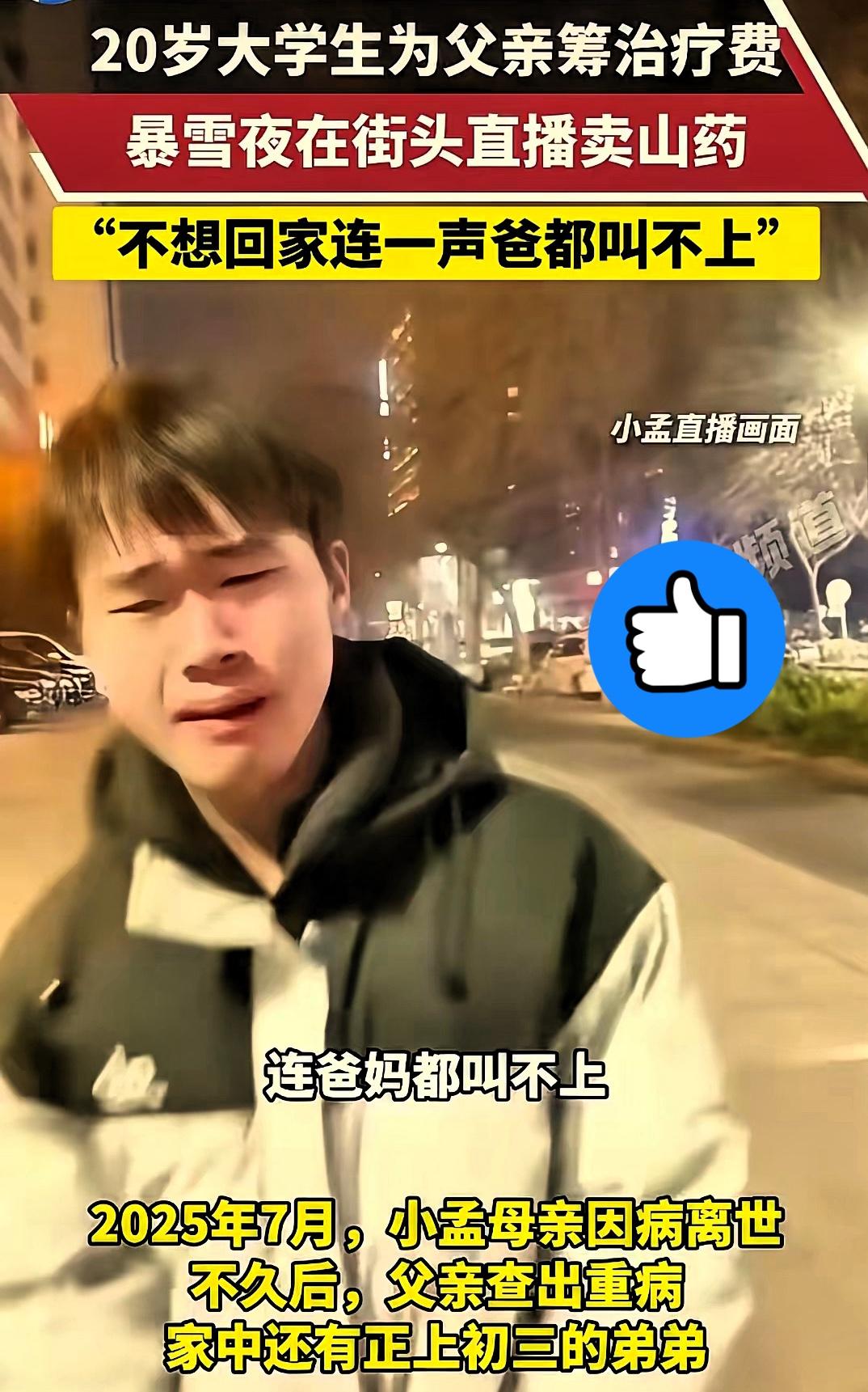 太心酸了!河南郑州 20岁男生小孟,大雪夜直播卖山药,只为撑起破碎的家。 母亲离世,父亲重病,还有上初三的弟弟,生活的重担全压在他一人肩上 小孟本该无忧无虑享受校园时光,却不得不面对如此残酷的现实。 他没有选择躺平抱怨,而是勇敢地站出来,通过直播卖货为父亲筹集医药费,供自己和弟弟上学。 他的武术和舞蹈,不过是为了多赚一点关注,多卖一点山药。 这份坚强和勇敢,让人动容。 小孟用行动告诉我们,生活虽苦,但只要心中有光,就能照亮前行的路。 你身边有没有这样坚强的人? 他们的事迹是否也让你深受鼓舞? 来评论区分享,一起传递正能量!