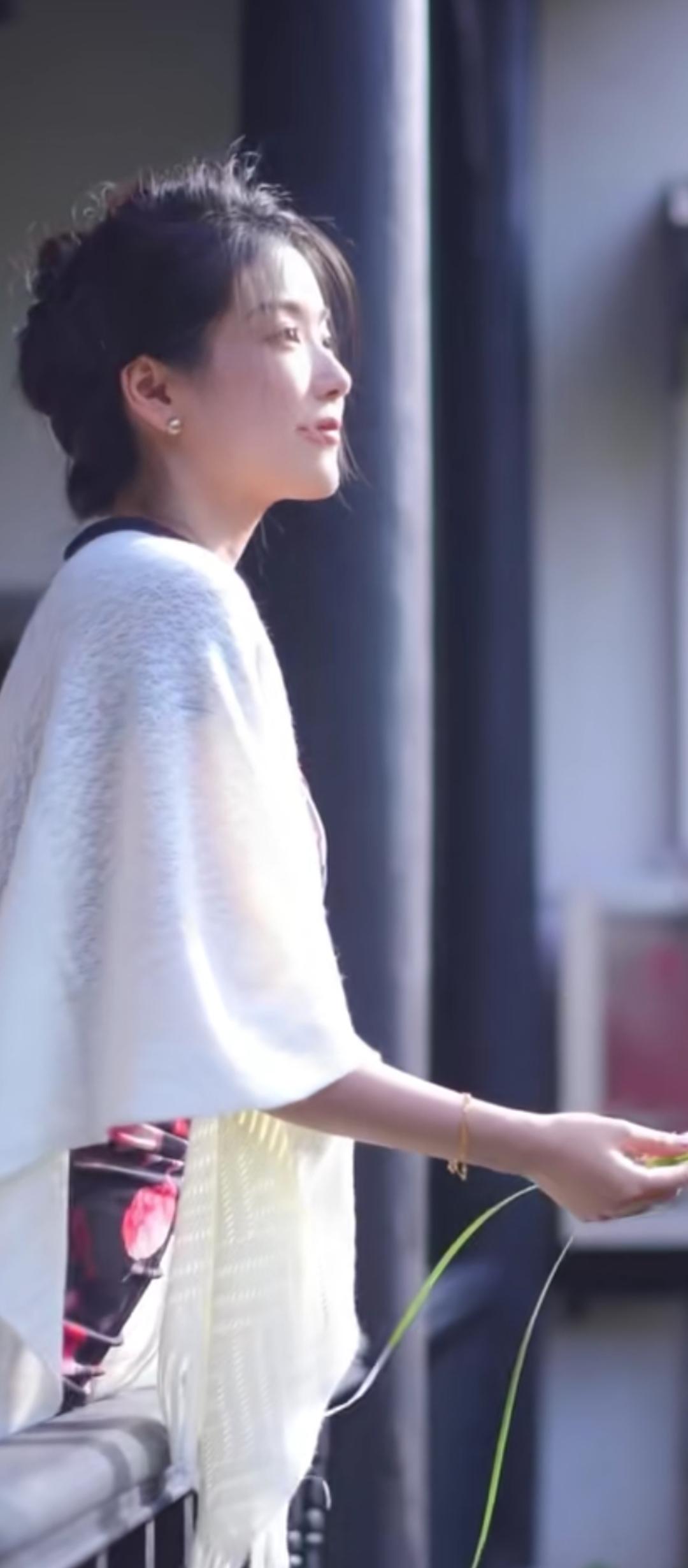 绿树阴中倚长凳,轻抚发丝思悠然。