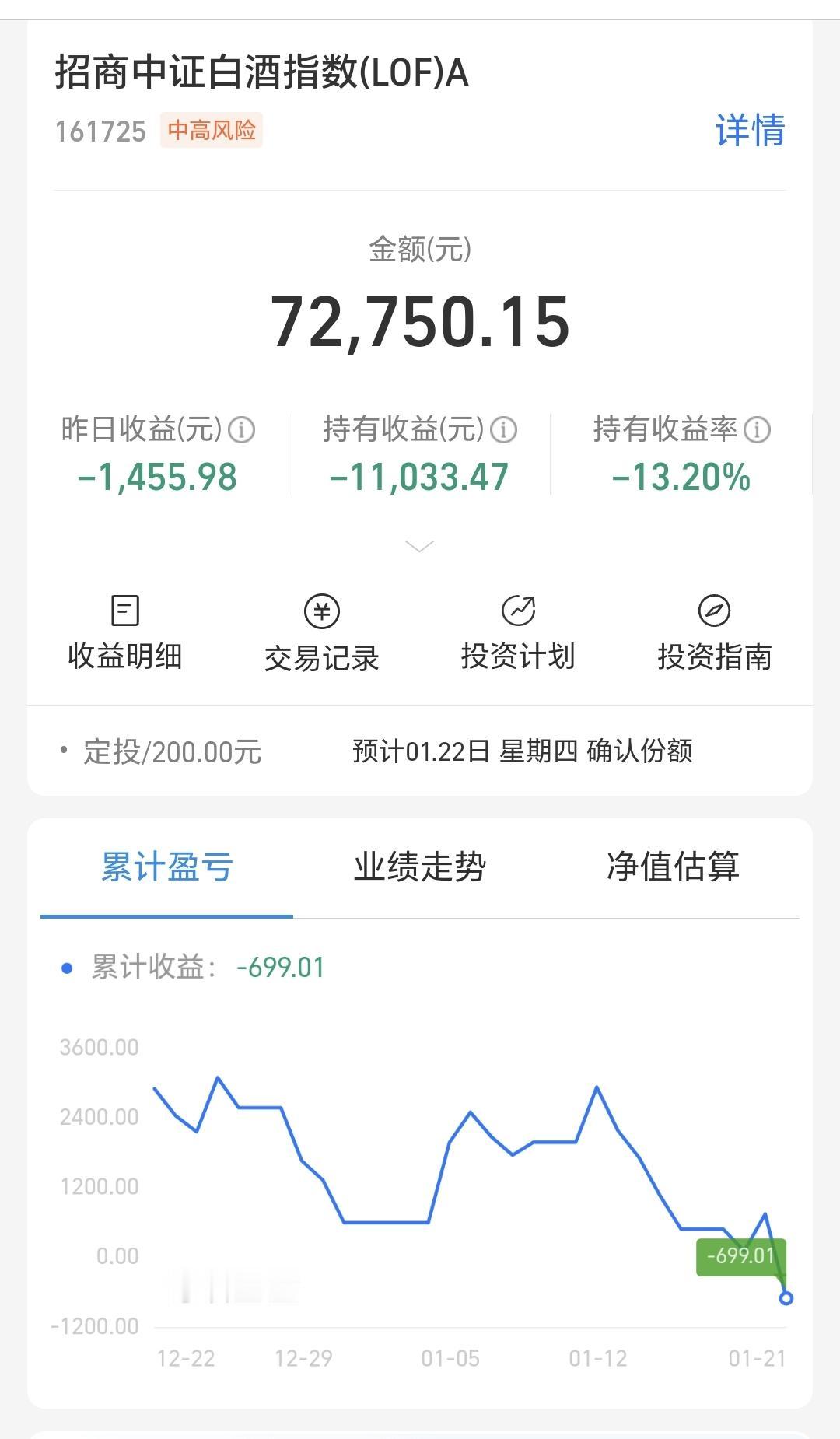 基金:昨天基金收益7969元,基金持有1024717元,现金持有934047元,现金收益25元,资产总额1958764元,就是一个横盘震荡的阶段。 今天市场如果高开以后,高走过程中成交量不能有效放大,也就是放大10%以上,谨防冲高回落。 白酒板块持有72750元,持有亏损11033元,持有亏损率13.20%,累计亏损699元,累计收益终于亏损了,每天定投200块钱的策略不变,直到到达10万块钱的仓位。 今天的压力位置是4135点和4148点,今天的支撑位置是4080点,最近静观其变就可以了,向上等待再一次止盈的机会,向下等待捞回止盈筹码的机会。