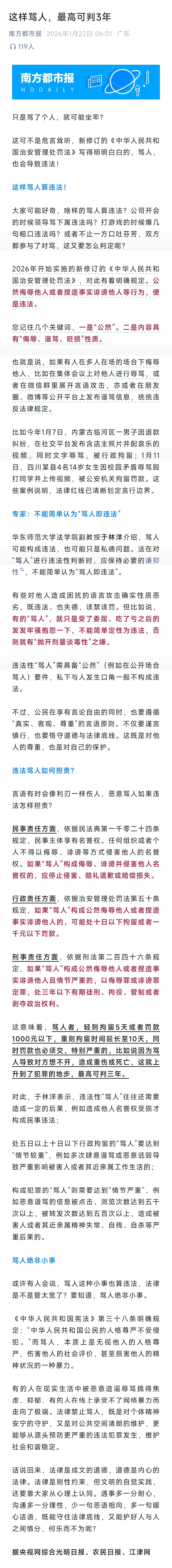 #这样骂人最高判3年#【这样骂人,最高可判3年】#公司领导开会骂下属算违法吗#只是骂了个人,就可能坐牢?这可不是危言耸听,新修订的《中华人民共和国治安管理处罚法》写得明明白白的,骂人,也会导致违法!这样骂人算违法!大家可能好奇,啥样的骂人算违法?公司开会的时候领导骂下属违法吗?打游戏的时候爆几句粗口违法吗?或者不止一方口吐芬芳,双方都参与了对骂,这又要怎么判定呢?2026年开始实施的新修订的《中华人民共和国治安管理处罚法》,对此有着明确规定。公然侮辱他人或者捏造事实诽谤他人等行为,便是违法。您记住几个关键词,一是“公然”。二是内容具有“侮辱、谩骂、贬损”性质。也就是说,如果有人在多人在场的场合下侮辱他人,比如在集体会议上对他人进行辱骂,或者在微信群里展开言语攻击,亦或者在朋友圈、微博等公开平台上发布谩骂信息,统统违反法律规定。比如今年1月7日,内蒙古临河区一男子因退款纠纷,在社交平台发布含店主照片并配哀乐的视频,同时文字辱骂,被行政拘留;1月11日,四川某县4名14岁女生因校园矛盾辱骂殴打同学并上传视频,被公安机关拘留罚款。这些案例说明,法律红线已清晰划定言行边界。