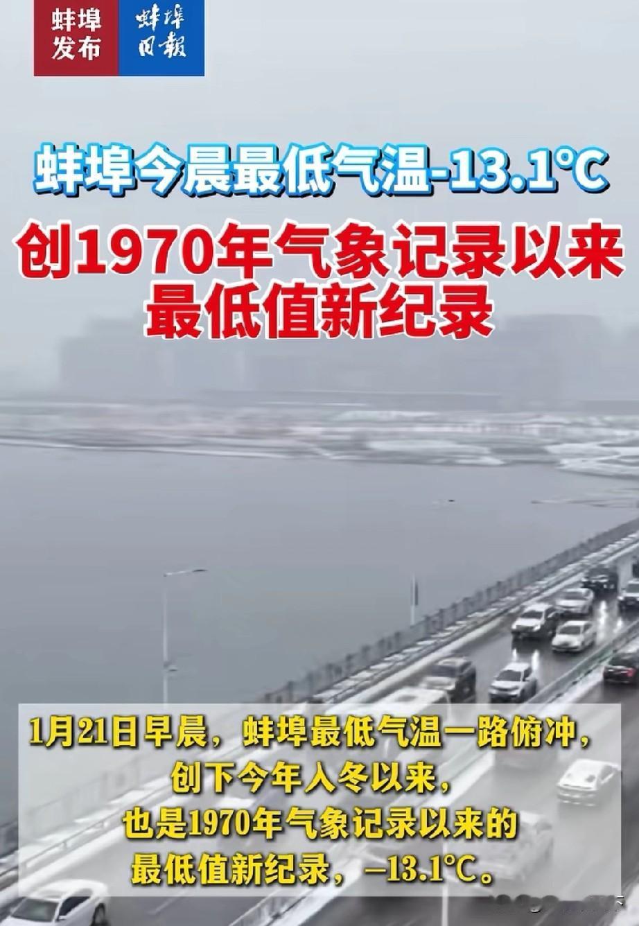 安徽省蚌埠市21号早上零下13.1度,是1970年以来最冷的一天 1月19号-20号,安徽省全省都在下雪,气温骤降,整个江淮大地就像突然被速冻起来一样。 位于中国南北分界线之间的安徽省蚌埠市,1月21号早上,最低气温零下13.1度,是1970年有气象记录以来最冷的一天。 秦岭—淮河一线是中国的南北分界线,蚌埠市正好位于淮河中游,淮河穿城而过,也将蚌埠市分为了淮河以北和淮河以南两个部分,淮河以北是北方,淮河以南是南方。 淮北、亳州、宿州、蚌埠、阜阳等市虽然是地理意义上的北方,但是安徽省全省都不供暖,冬天也是非常冷的。 好消息是,从今天开始,安徽省全省气温都在缓慢回升,就没有那么冷了。蚌埠 安徽冬季 蚌埠暴雪 安徽蚌埠暴雪 蚌埠雪景
