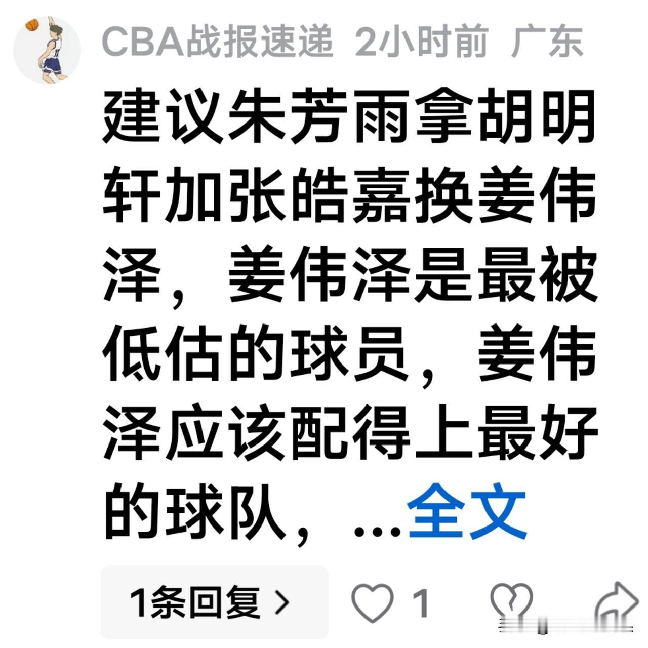 CBA战报速递:建议朱芳雨用胡明轩+张皓嘉换姜伟泽? 刚刚看到一个评论区,一位CBA战报速递的广东球迷给朱芳雨建议:用胡明轩+张皓嘉去单换姜伟泽,我认为几乎不可能的事,主要原因只有两个: 1.胡明轩是国手,又是广东队队长,杜锋执教三连冠的主要功臣,广东队目前招牌球星。 2.姜伟泽个人能力确实不错,但是与胡明轩级别不同,再说胡明轩是一名顶薪球员,吉林队薪资有限,留用姜伟泽性价比更高,毕竟吉林队即使得到胡明轩也未必能给球队带来更多的比赛胜利,吉林队整体实力一般,不是引进一名球员就能改变球队战绩的事。 对此!大家有什么不同看法呢?欢迎评论区留言!