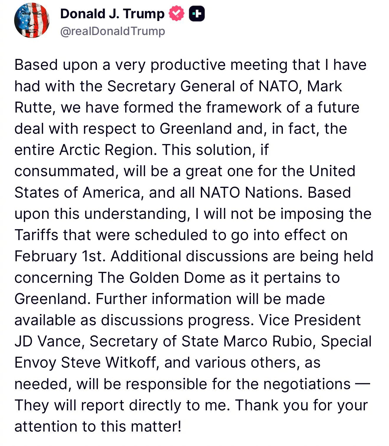 特朗普称与北约达成格陵兰合作框架当地时间1月21日,美国总统特朗普在其社交媒体“真实社交”上发文称,基于他与北约秘书长吕特进行的一次“富有成效”的会晤,他们已经就(丹麦自治领地)格陵兰岛乃至整个北极地区的未来合作框架达成了一致。特朗普称,如果这项方案最终得以落实,“将对美国和所有北约成员国都大有裨益”。特朗普称,“基于这一共识,我将不会实施原定于2月1日生效的关税措施。”特朗普称,关于美国“金穹”导弹防御项目在格陵兰岛相关事宜的进一步讨论正在进行中。随着磋商推进,将适时公布更多信息。美国副总统万斯、国务卿鲁比奥、总统特使威特科夫等人将负责相关谈判。 特朗普当地时间1月17日曾通过社交媒体宣布,将从2月1日起对反对美国得到格陵兰岛的8个欧洲国家输美商品加征10%的关税。(央视)
