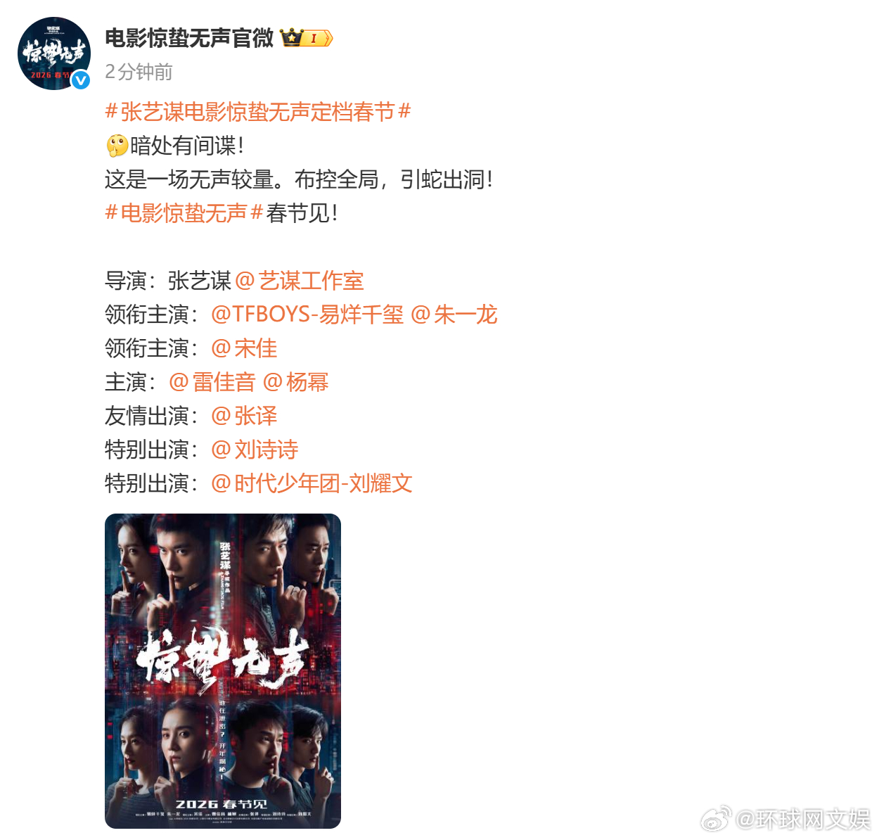 【#4部影片定档2026春节档上映# 】由张艺谋执导,等出演的电影《惊蛰无声》,今日官宣定档2026年春节。截至当前共4部影片定档2026年春节档上映,除了#电影惊蛰无声# 还有:《飞驰人生3》(等主演)《镖人:风起大漠》(等出演)《熊出没·年年有熊》#2026春节档# 你期待哪部影片/哪个角色?