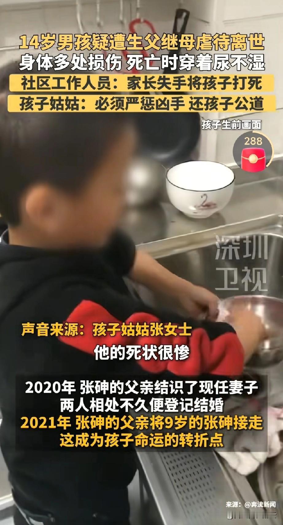 你敢想象吗?14岁男孩离开人世时只有1米4高,瘦的皮包骨头,姑姑说他的胃里一点食物都没有,几乎是前胸贴后背,身上没有一点脂肪。 这个可怜的男孩是被后妈和亲爸虐待致死的,男孩离开的时候,他爸爸也没通知他的奶奶和姑姑,姑姑说孩子没了一个月后,她们还是在警方口中得知孩子没了的消息。 爸爸虽然是主动投案自首的,但是他没有一点悔意。说是自己管教儿子时失手打死了,把责任全揽在自己身上了,所以后妈暂时没有被强制执行。 我不理解的是,明明男孩9岁前一直是跟着姑姑和奶奶生活,她们把孩子照顾的很好。男孩爸爸是大货车司机,经常不在家,和孩子交流也不多,应该感情也一般。 为什么他二婚后,非要把孩子接到自己身边,还不让姑姑她们见孩子。难道是为了某种目的? 想想孩子在他们身边5年,到离开这个人世间还是一身伤,空着肚子走的,我就泪流满面。这个孩子到底经历了什么?5年来,他过着怎么的生活?
