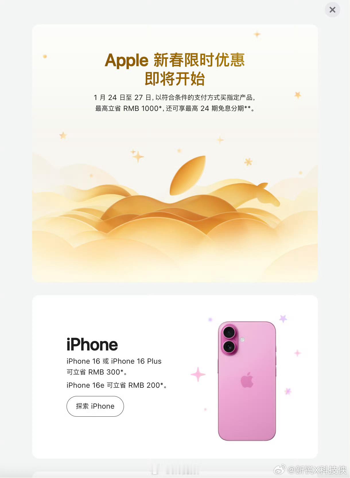 苹果推出新春优惠,这次优惠覆盖还挺全的,手机平板电脑耳机手表都有份,最高能省1000块,还能叠24期免息。但17系列并不参加,这事儿真一点不意外,毕竟iPhone17刚上没多久正是卖得火的时候,怎么可能赶新春搞优惠。说白了就是新机不愁卖,没必要靠降价冲量,还得保住高端价盘,也不亏了首发入手的人。看来看去,优惠全堆在iPhone16这些旧款上,清库存冲销量罢了。想趁新春捡漏17的官方这反正没指望,顶多蹲蹲地方补贴或者第三方小让利。不得不说苹果这定价套路是真稳,永远把新旧款的价格差和优惠节奏拿捏得死死的。苹果回应iPhone17不参加新春优惠