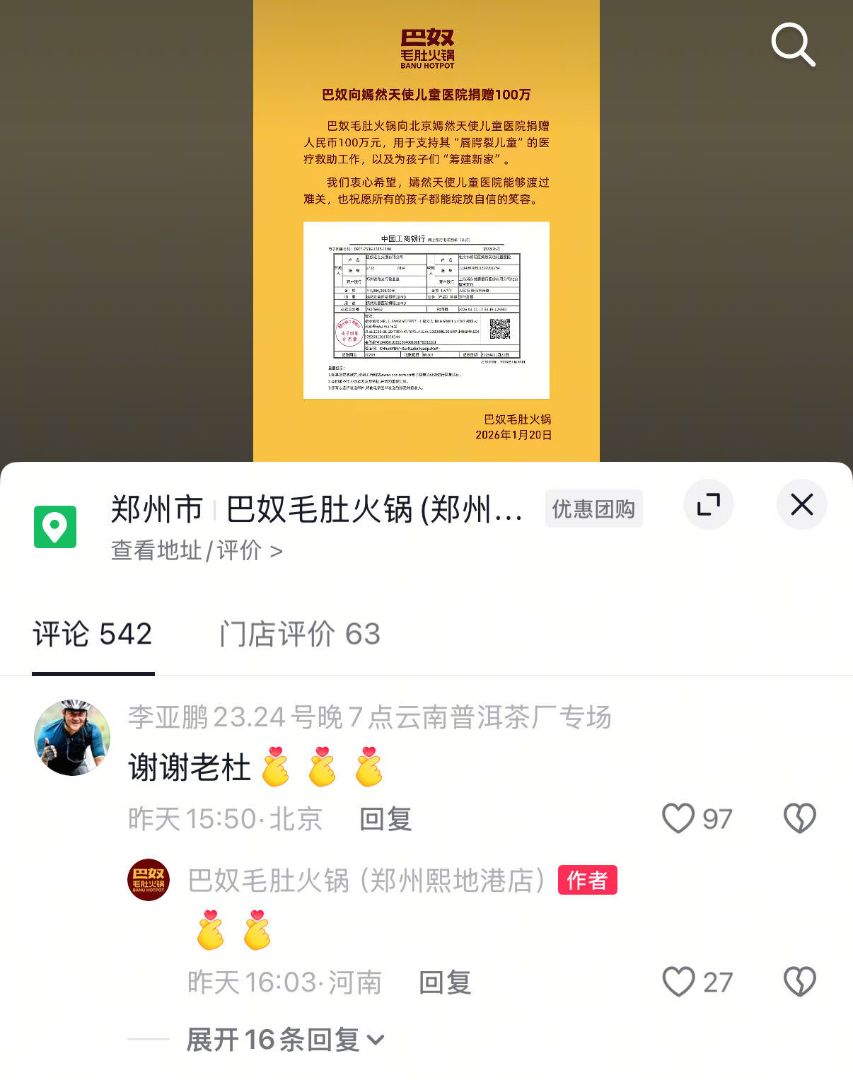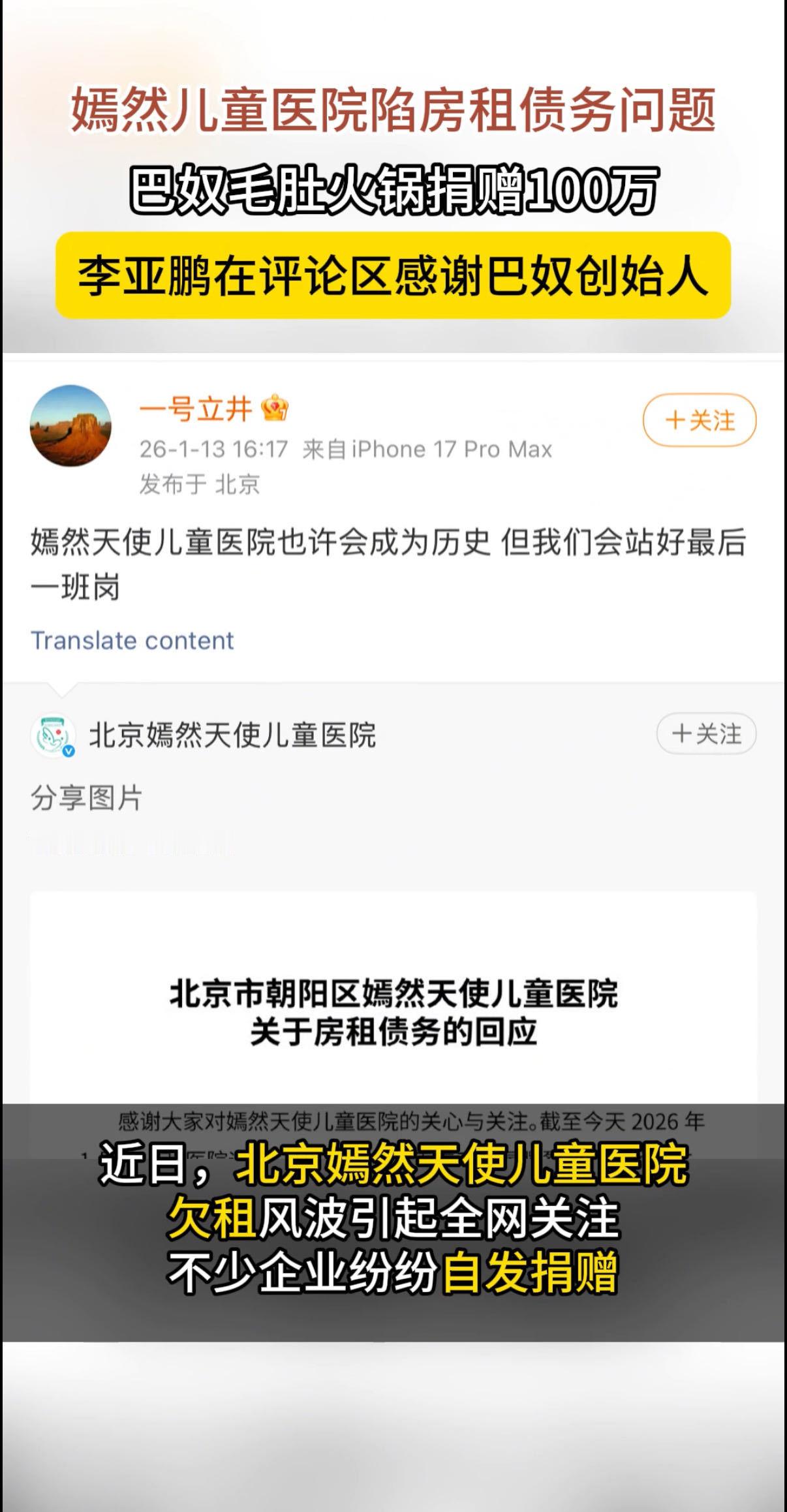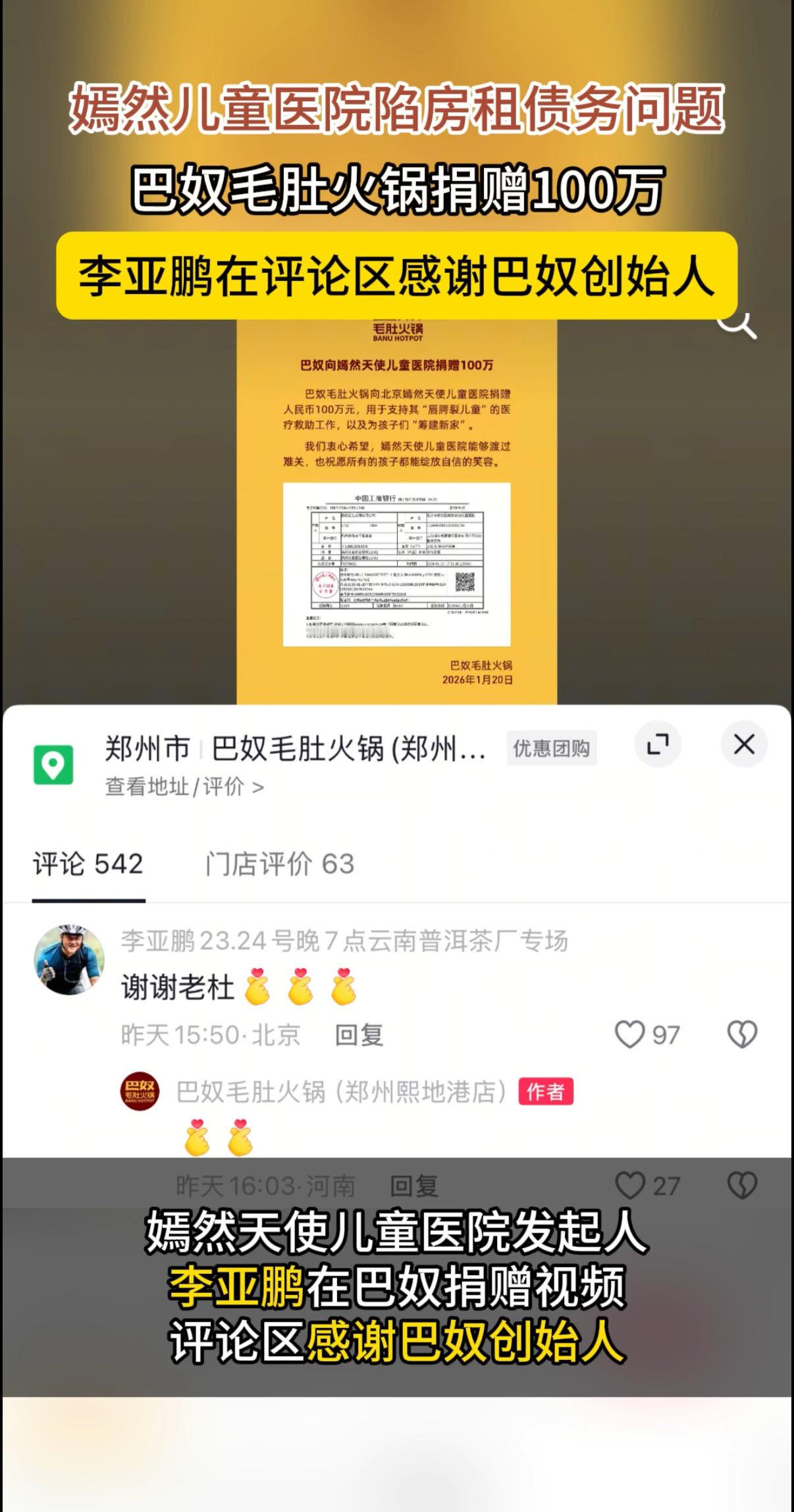李亚鹏感谢巴奴捐款李亚鹏在评论区感谢巴奴创始人巴奴向嫣然天使基金捐款,助力唇腭裂儿童救助与“新家”筹建,李亚鹏在评论区表示感谢。最近天冷,请多来点这么温暖的消息吧!巴奴在盈利之余反哺社会,既为困境中的孩子送去希望,也为行业树立了责任标杆。这样的“暖心火锅”,让商业价值与社会温度相融,值得点赞与效仿!