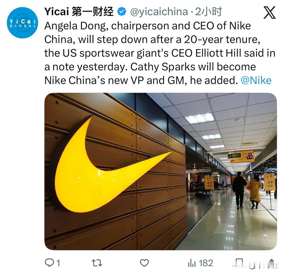 耐克(Nike)大中华区董事长兼首席执行官董炜(Angela Dong)将离职,结束其长达20年的任期。她的职位将由 Cathy Sparks 接替。 耐克正寻求扭转大中华区销售额下降的局面,此次领导层变动是其“立即赢取”(Win Now)战略的一部分。 董炜将于2026年3月31日正式离开公司。 继任者: Cathy Sparks,一位在耐克工作25年的资深人士,此前担任亚太区和拉丁美洲(APLA)副总裁兼总经理,将成为耐克大中华区新任副总裁兼总经理。 耐克总裁兼首席执行官 Elliott Hill 表示,Sparks 将专注于重建势头,并重新将品牌与中国市场的体育和文化联系起来。