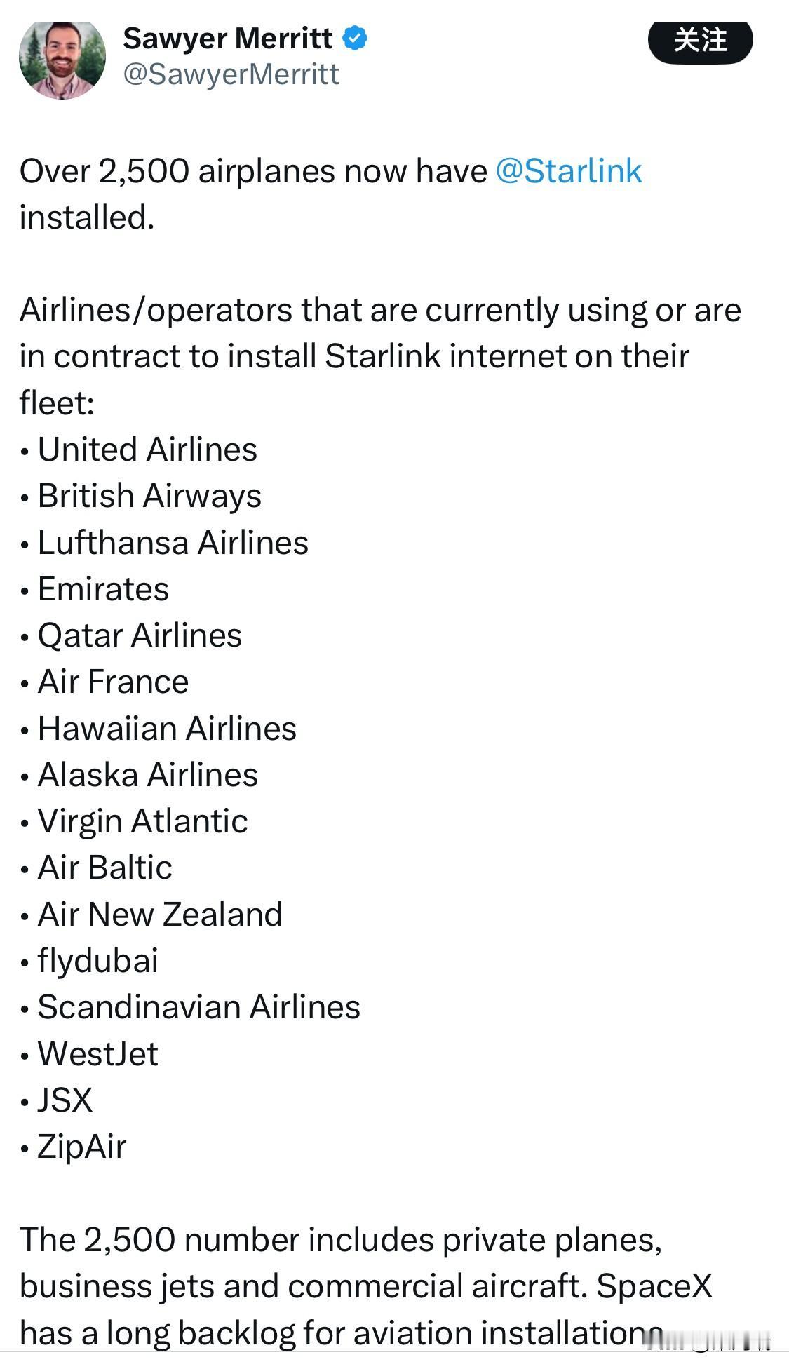 目前有超过 2,500 架飞机安装了 马斯克旗下的星链(Starlink )服务,此数字包括私人飞机、商务喷气机和商业飞机 。 合作航空公司:以下航空公司/运营商目前正在使用或已签约在其机队上安装 Starlink 互联网: 联合航空 (United Airlines) 英国航空 (British Airways) 汉莎航空 (Lufthansa Airlines) 阿联酋航空 (Emirates) 卡塔尔航空 (Qatar Airlines) 法国航空 (Air France) 夏威夷航空 (Hawaiian Airlines) 阿拉斯加航空 (Alaska Airlines) 维珍大西洋航空 (Virgin Atlantic) 波罗的海航空 (Air Baltic) 新西兰航空 (Air New Zealand) 迪拜航空 (flydubai) 斯堪的纳维亚航空 (Scandinavian Airlines) 西捷航空 (WestJet) JSX ZipAir 未来前景:SpaceX 在航空安装方面有很长的积压订单 。