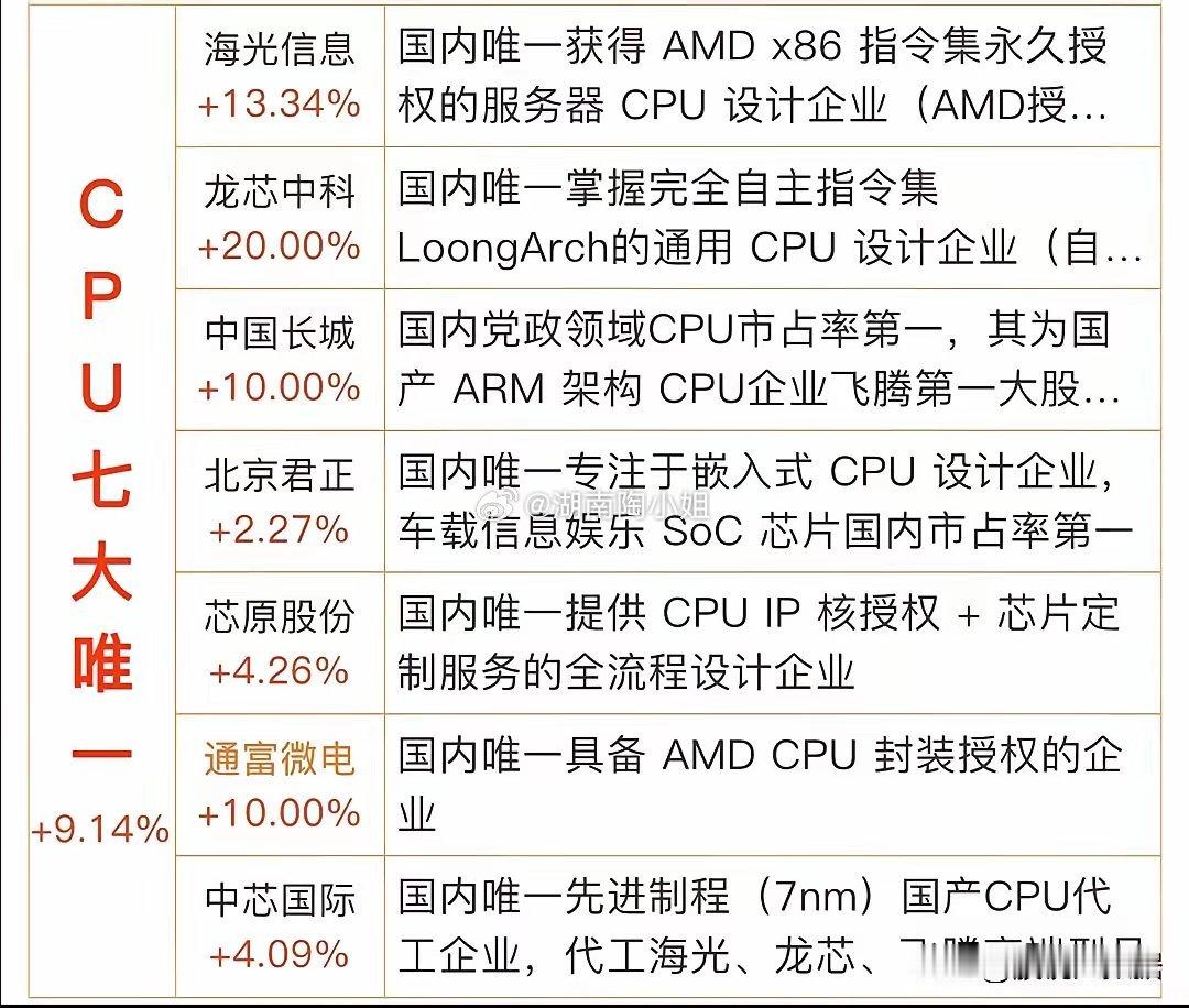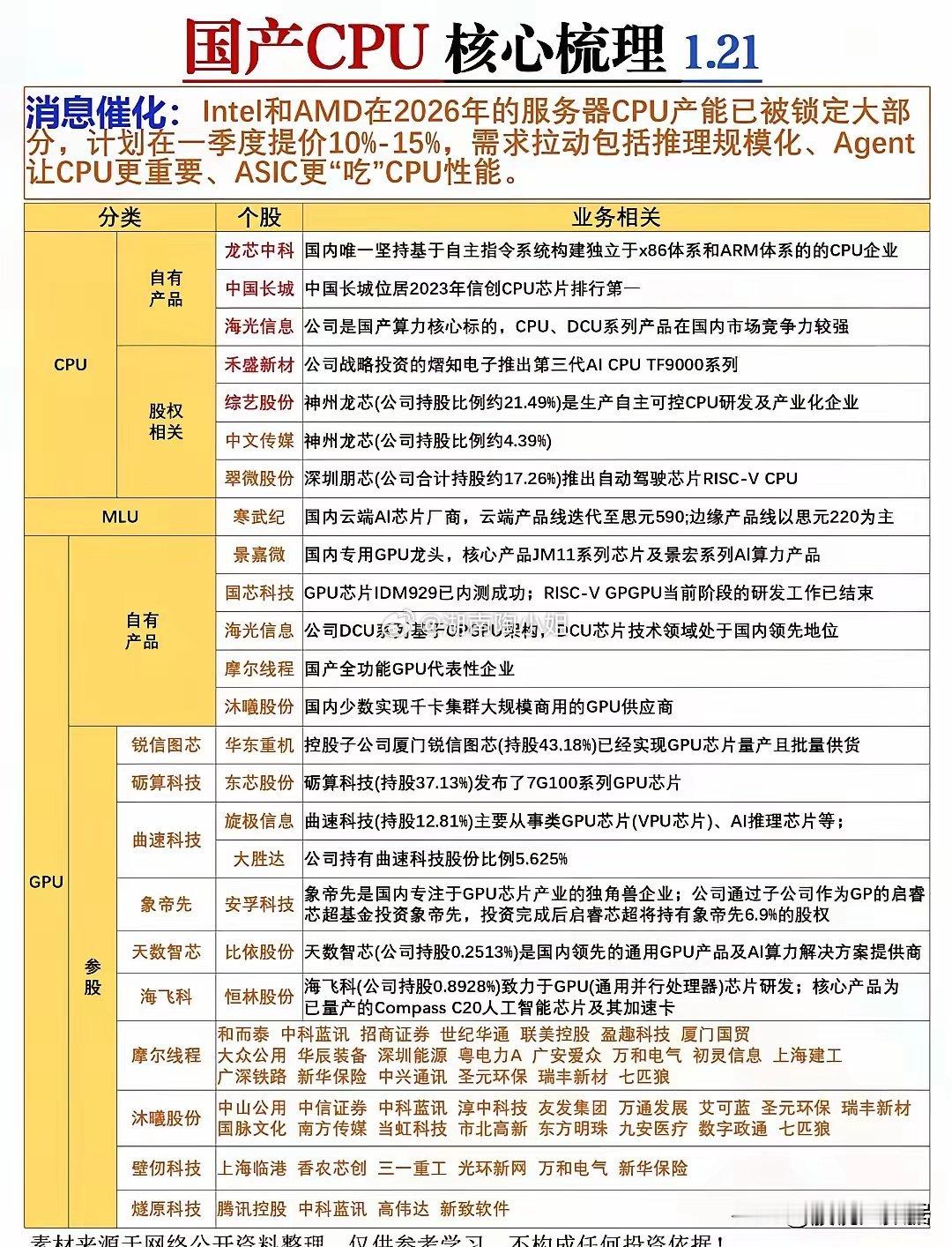 突发利好!国产CPU迎来风口,核心标的全梳理,相关概念七大唯一性龙头代表有哪些?CPU是中央处理器,是计算机/服务器的运算和控制核心。1月21日消息 Intel和AMD计划2026年一季度服务器CPU提价10%-15%。算力需求陡增,国产替代提速迎双重红利。相关概念唯一性龙头值得关注!龙芯中科行业自主可控核心龙头;海光信息行业高性能算力主力;中国长城行业党政市场市占率第一;北京君正行业设计市占率国内第一~……国产算力产业链迎来戴维斯双击,把握自主可控主线,精选技术领先、卡位核心的标的,分享算力革命红利!理财有风险投资需谨慎!祝大家马年踏准节奏,精准布局选对标的,拿捏行情,财源广进,投资顺利,持仓日日飘红,财源滚滚来