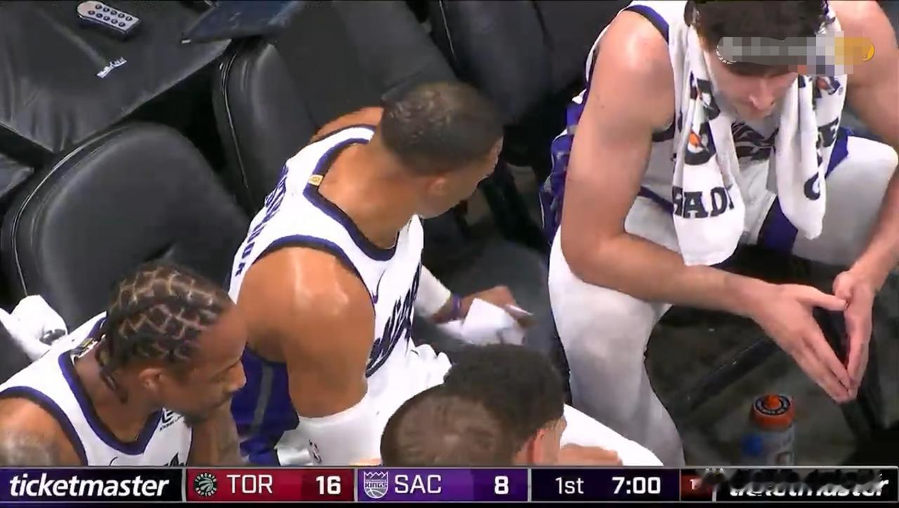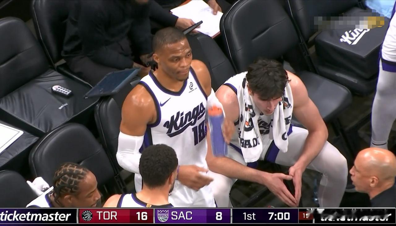 国王球星威斯布鲁克真是气炸了!在今天国王主场迎战猛龙的比赛中,当时比赛进行到了第一节的7分钟,国王以8:16落后于对手,国王被迫叫了一个暂停。在暂停期间,转播镜头给到了国王的替补席,只见威少在看了一眼数据统计后非常的生气,他直接将数据统计揉成了一团然后扔在了地上,整个人看起来非常的愤怒。从威少的面部表情来看,此时此刻他对自己和球队的表现是非常不满的。