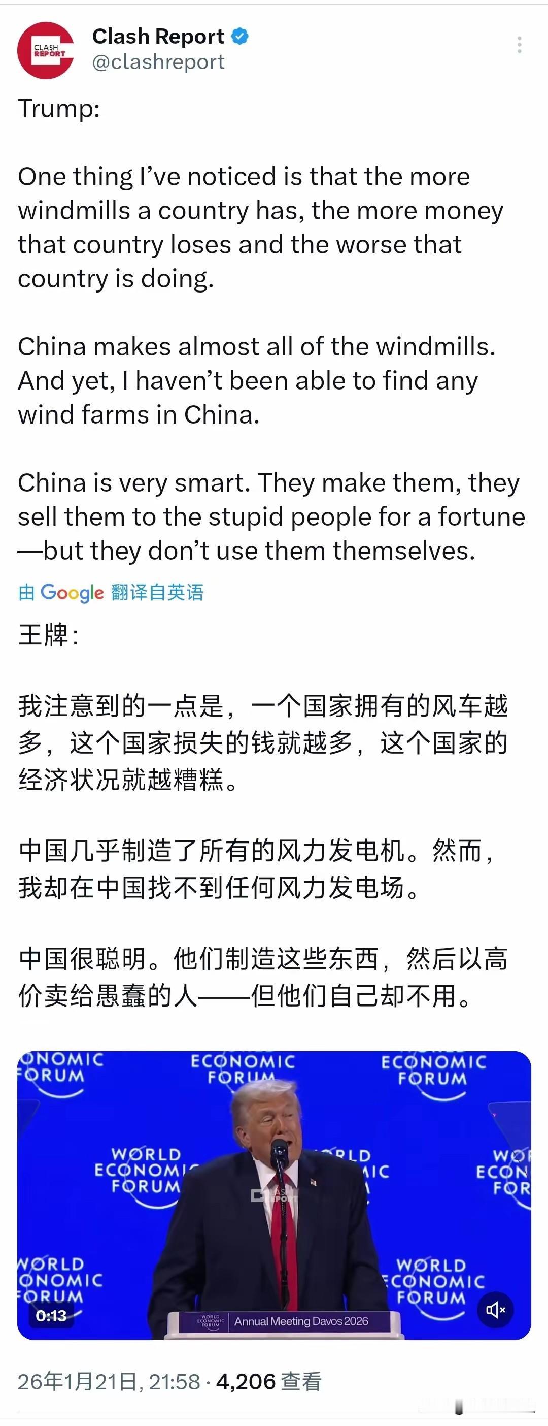 特朗普刚刚在达沃斯论坛上又胡说八道了。特朗普表示:“我注意到的一点是,一个国家拥有的风车越多,这个国家损失的钱就越多,这个国家的经济状况就越糟糕。中国几乎制造了所有的风力发电机。然而,我却在中国找不到任何风力发电场。中国很聪明。他们制造这些东西,然后以高价卖给愚蠢的人但他们自己却不用。” 这话一出口,恐怕达沃斯会场里好多企业家和能源专家都憋不住笑了。特朗普先生,您来中国旅游的时候,是不是光顾着看高楼大厦,没往草原、海边和戈壁滩上瞅一眼?您这结论,比风车转得还快,就是一点不着地。 说中国找不到风力发电场?这玩笑开大了。咱们国家西北的戈壁滩上,一片片“白色森林”望不到边。根据国家能源局发布的数据,截至去年底,中国风电累计装机容量已经突破4.4亿千瓦,稳居世界第一。这4.4亿千瓦的“大风车”,难道都是隐形的? 从内蒙古辽阔的草原到江苏绵长的海岸线,大风车早就成了常见的风景。它们不仅立着,还拼命转着,发的电点亮了千家万户。中国风电年发电量超过9000亿千瓦时,相当于节省了上亿吨煤炭。这叫不用?这叫用得聪明,用得扎实! 特朗普的逻辑堪称神奇:造风车等于赔钱,卖风车等于坑人。按这个说法,全球最大的风电市场欧洲各国,还有积极发展风电的美国部分州,岂不都成了“愚蠢的人”?这地图炮开得,把自己的盟友都扫进去了。 他的话里透着一股熟悉的酸味儿。看到中国在一个高端制造领域占据了全球超过一半的供应链,心里不是滋味。贬低不了你的质量,就开始编故事质疑你的动机。这套路,咱们见多了。 风电产业在中国,是实打实的绿色引擎。它带动了从玻璃纤维、碳纤维到智能控制系统一整条产业链的发展,创造了大量高技能就业岗位。这不是赔钱买卖,这是面向未来的战略投资。 特朗普的言论,暴露出他对现代能源产业的理解,还停留在非常表面的层次。风电早就不是补贴依赖的“赔钱货”,其度电成本在过去十年里下降了超过70%,在很多地区比化石能源还便宜。这才是它全球流行的根本原因。 把中国的成功简单归结为“卖东西给傻瓜”,这是一种傲慢的误读。中国风电出海,靠的是过硬的技术、有竞争力的成本和完整的项目运维能力。德国、丹麦这些传统风电强国都在买,难道他们不懂行? 这种信口开河,损害的其实是美国自己的信誉。达沃斯汇聚了全球精英,大家心里都有一本账。为了攻击而攻击,为了否定而否定,最终只会让世界觉得,有些人的话,听听就好,千万别当真。 中国的风车,立在广袤的土地上,也立在清晰的能源转型战略里。我们既制造,也大规模应用,更持续创新。事实就像戈壁上永不停歇的风,有力而沉默,足以吹散一切毫无根据的臆想和充满偏见的谎言。 各位读者你们怎么看?欢迎在评论区讨论。 欧洲对特朗普 聊特朗普 特朗普雷人言论 特朗普经济霸权 特朗普争议发言 特朗普怒斥美国