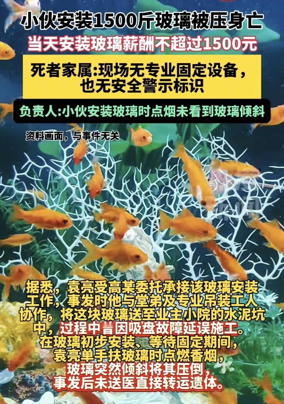陕西西安一31岁小伙在给某小区安装鱼池玻璃,石手单手抬起1500斤的玻璃时意外被砸身亡,这一期工程是有其他人分包给男子,男子在有其堂弟一起和吊装工人把玻璃安装,但是因为过程中吸盘故障的原因延误了施工,在等待固定的时候男子收。点烟时单手举起1500斤的玻璃,这时玻璃倾斜把篮子压住。