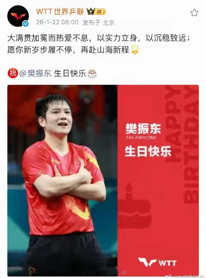 1月22日国际奥委会、国际乒联和吴敬平教练发文,祝樊振东生日快乐! 今天是樊振东的生日,虽然他近年没有参加WTT的赛事,但是他在乒超和德甲的优异表现,依然有广大球迷的拥护和支持,对推动乒乓球的国际化交流和发展有着巨大贡献,具有超高的人气。 无论作为青奥会、奧运会,还是乒超冠军,樊振东可谓所向披靡,一路高光。祝愿樊振东步履不停,跨越山海,继续攀登一座座高峰,继披波斩浪,抵达一个个胜利的彼岸。 在这里,我们祝樊振东生日快乐,一路长虹!