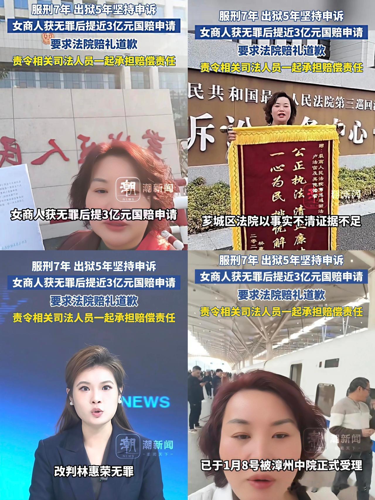 服刑7年、申诉5年!女商人获无罪后索赔近3亿! 家人们,这事儿太震撼了! 2016年,福建女商人林惠荣原本经营着一家红火的金融担保公司,却突然被指控“非法吸收公众存款”,直接被羁押,后被判处有期徒刑7年。 她在狱中坚持喊冤,但无人理会。2021年刑满释放后,她没有放弃,变卖了仅剩的家产,拖着一身病痛开始了长达5年的申诉之路。 这期间,她无数次往返于各级法院,提交了上百份材料,甚至因为长期奔波导致身体垮掉。直到2025年12月,芗城区法院终于以“事实不清、证据不足”为由,宣告她无罪。 如今,她向漳州中院提出了近3亿元的国家赔偿申请,核心诉求包括: - 经济赔偿:7年人身自由赔偿金、精神损害抚慰金,以及因公司倒闭、资产冻结造成的经营损失,总计近3亿元。 - 追责要求:要求法院公开赔礼道歉,并责令当年承办案件的相关司法人员承担连带赔偿责任。 目前,漳州中院已在2026年1月8日正式受理了她的申请。 2025年12月,芗城区法院终于以“事实不清、证据不足”宣告她无罪。12年光阴,从商界女强人到阶下囚,再到为正义奔走的申诉者,她用整个中年时光,换来了这迟来的清白。 如今,她提出近3亿元的国家赔偿申请,不仅是为了弥补经济损失,更是为了讨回一个公道。 你觉得,这近3亿的国家赔偿合理吗?