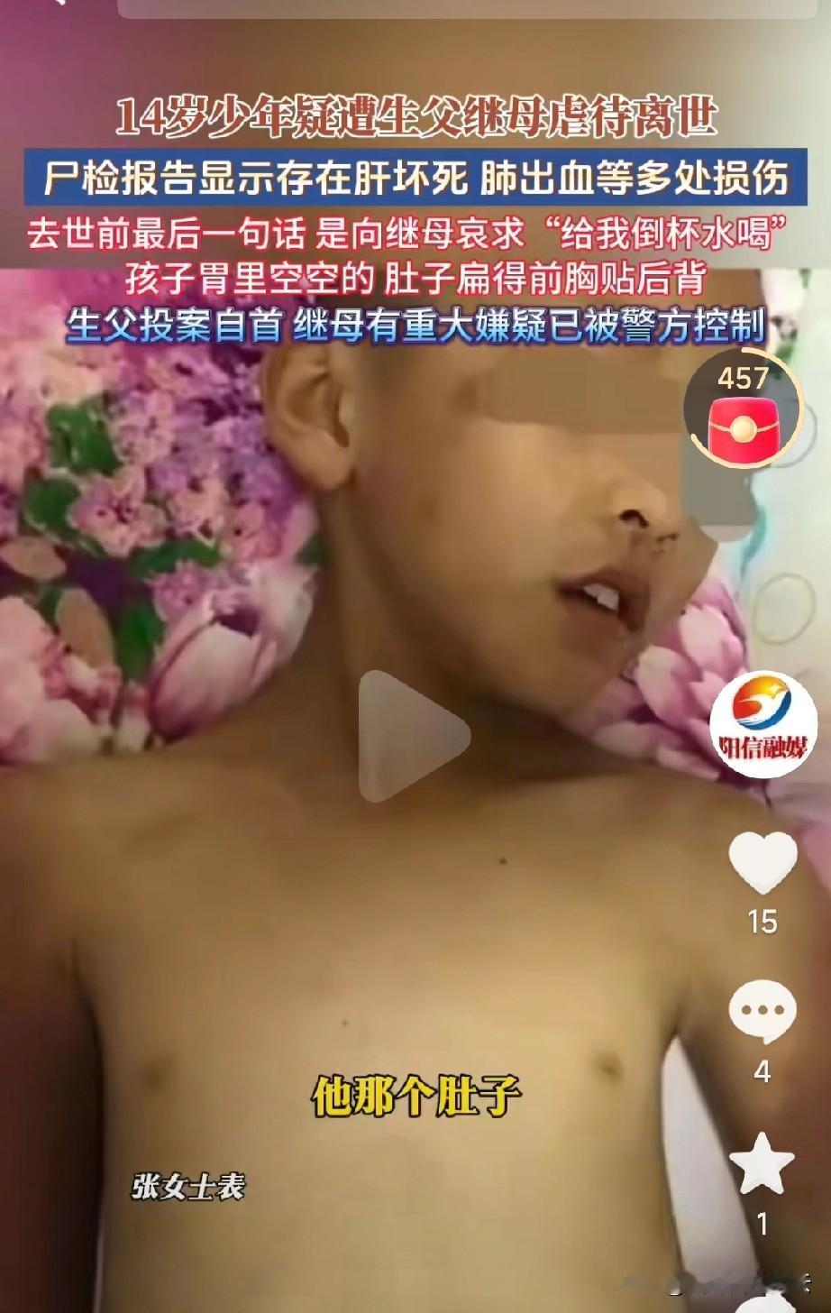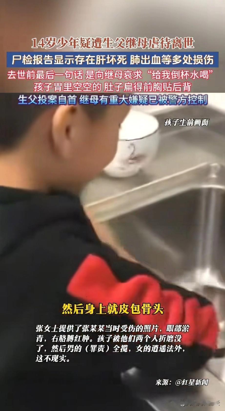 河南被亲爸和继母虐待的男孩,姑姑养着的时候,白白净净的,孩子也很懂事,会帮姑姑做家务。 姑姑只能提供孩子9岁前的照片,因为9岁后,孩子被爸爸和继母接走后,他们就不让姑姑和奶奶见孩子了。 那个继母也是二婚,她自己的孩子也跟着他们生活,她的孩子被养的白白胖胖的。可是男孩呢,14岁只有1米四高,去世后S检报告里说胃是空的,瘦的皮包骨头。警方说被长期虐待。 要说一起生活了5年,继母对此都不知情,打死我也不信。