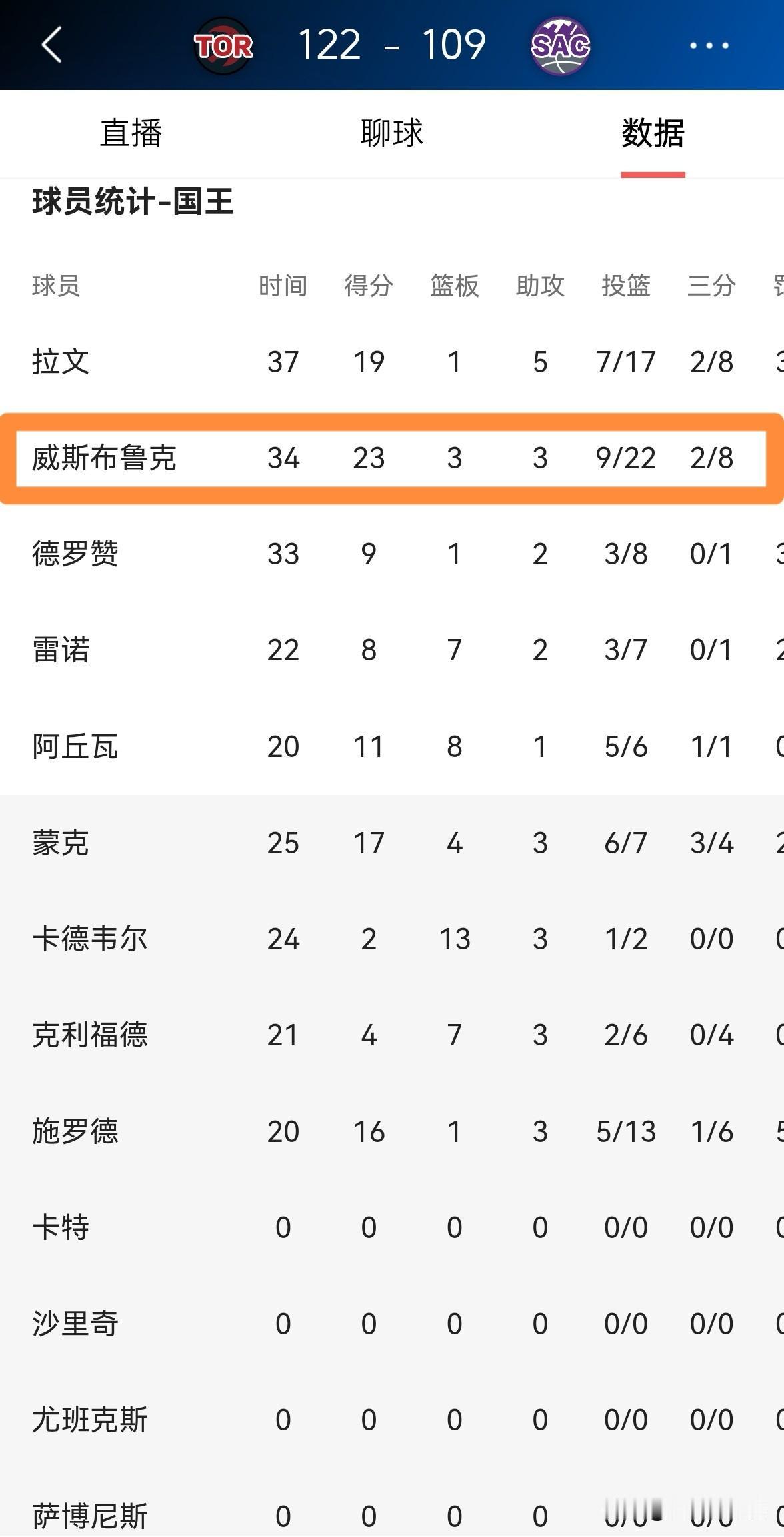 国王老将威斯布鲁克的进攻欲望真是异常强烈!在今天国王主场以109:122输给猛龙的比赛中,37岁的威斯布鲁克展现出了超强的进攻欲望,全场比赛下来他疯狂的出手22次。 整场比赛下来,威少首发出战34分钟,投篮22中9,其中三分球8中2、罚球3中3得到23分3篮板3助攻3抢断,还有4次失误,他的场上正负值为-16。