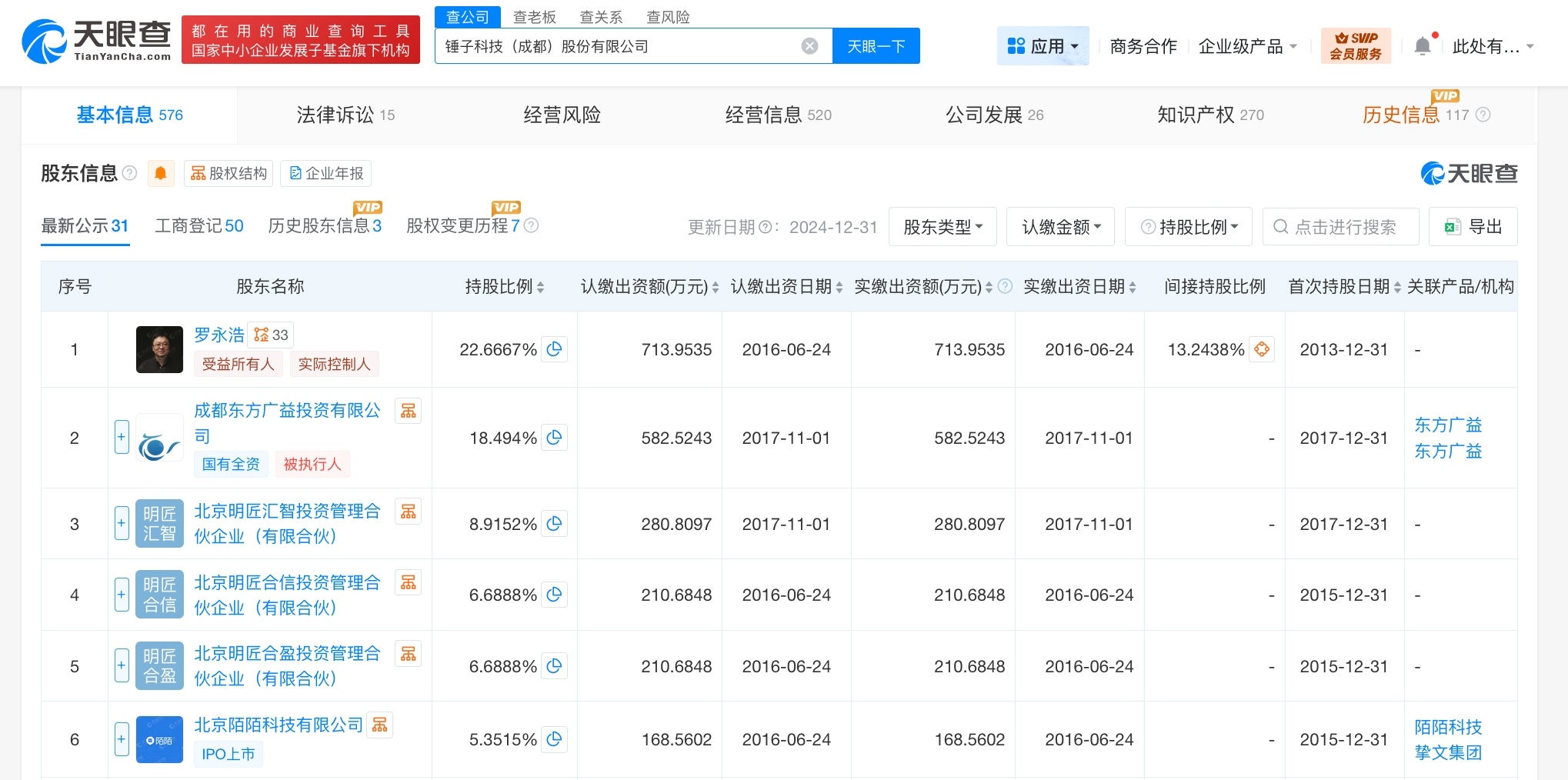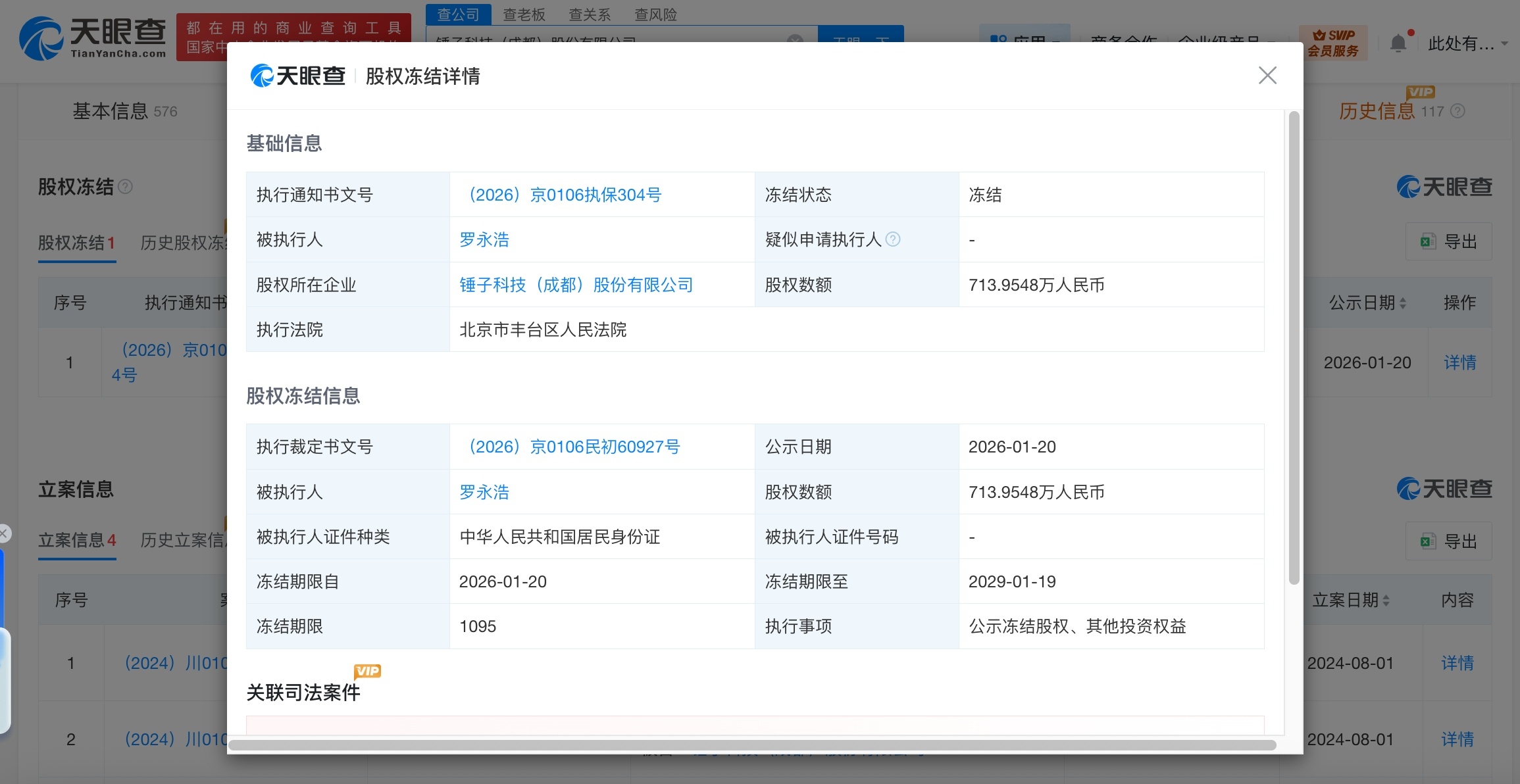 【#罗永浩被冻结713万股权# #罗永浩所持锤子科技713万股权被冻结#】天眼查天眼风险信息显示,近日,罗永浩新增一则股权冻结信息,股权所在企业为锤子科技(成都)股份有限公司,冻结股权数额713万余元,冻结期限自2026年1月20日至2029年1月19日,执行法院为北京市丰台区人民法院。工商信息显示,锤子科技(成都)股份有限公司成立于2012年5月,法定代表人为管志良,注册资本约3149.8万人民币,经营范围含基础软件服务、应用软件服务、组织文化艺术交流活动、维修通讯设备、生产手机等。股东信息显示,该公司由罗永浩、成都东方广益投资有限公司、北京明匠汇智投资管理合伙企业(有限合伙)等共同持股。