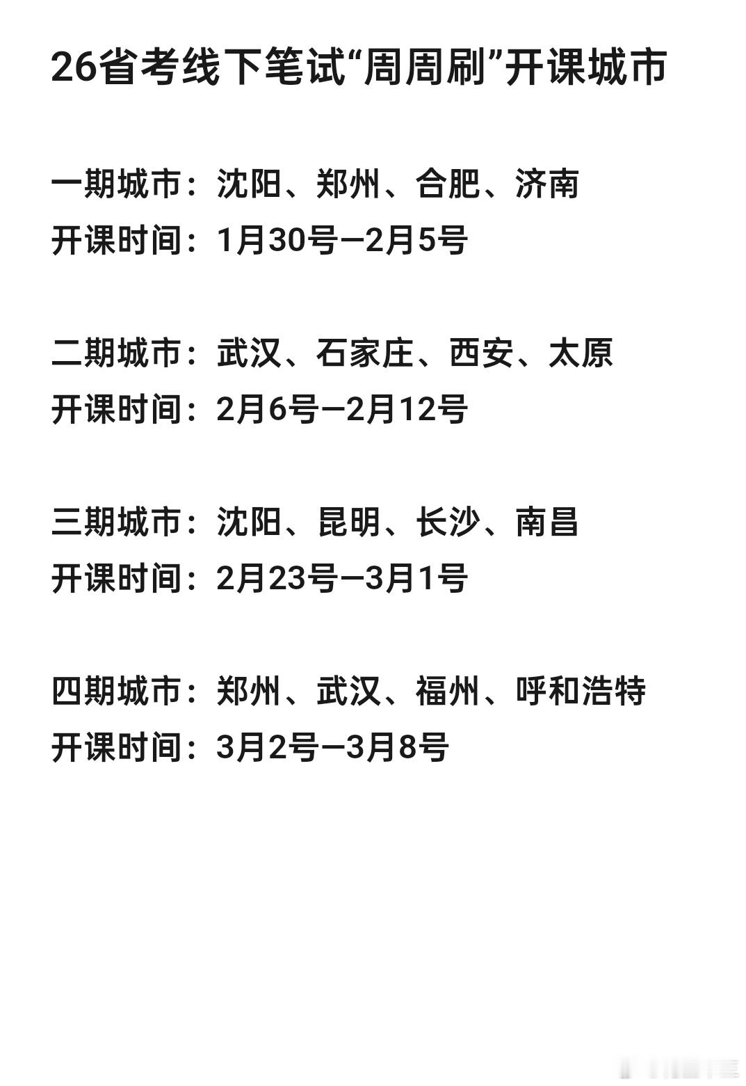 同学们,26省考线下笔试“周周刷”三、四期开课城市确定啦!三期城市:辽宁沈阳、云南昆明、湖南长沙、江西南昌开课时间:2月23号——3月1号(7天6晚,12套行测)四期城市:河南郑州、内蒙古呼和浩特、湖北武汉、福建福州开课时间:3月2号——3月8号(7天6晚,12套行测)明天下午1点半,“四海公考”APP准时上架!省考